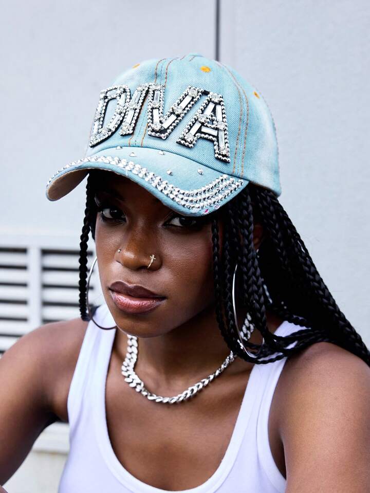 Grunge Punk 1pc Punk Rhinestone Denim Baseball Cap, Y2K Retro Devil Letter Pattern Embellished Adjustable Snapback Hat, Casual Streetwear
