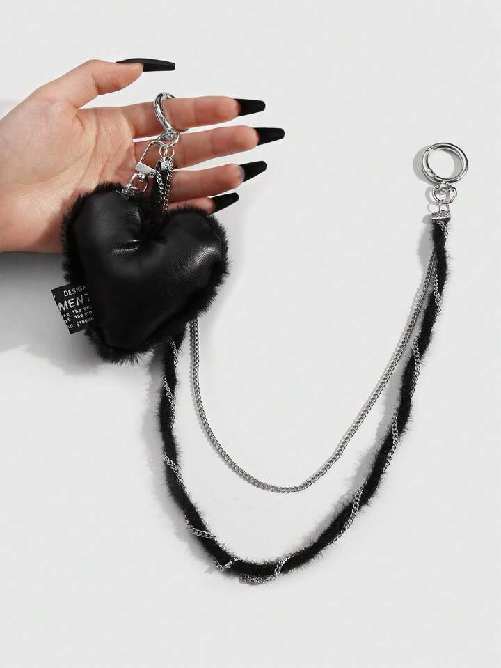 Grunge Punk 1pc Punk Style Gothic Silver Chain Black Fuzzy PU Leather 3D Heart Decorative Chain Belt, Suitable For Women, Holiday Gift