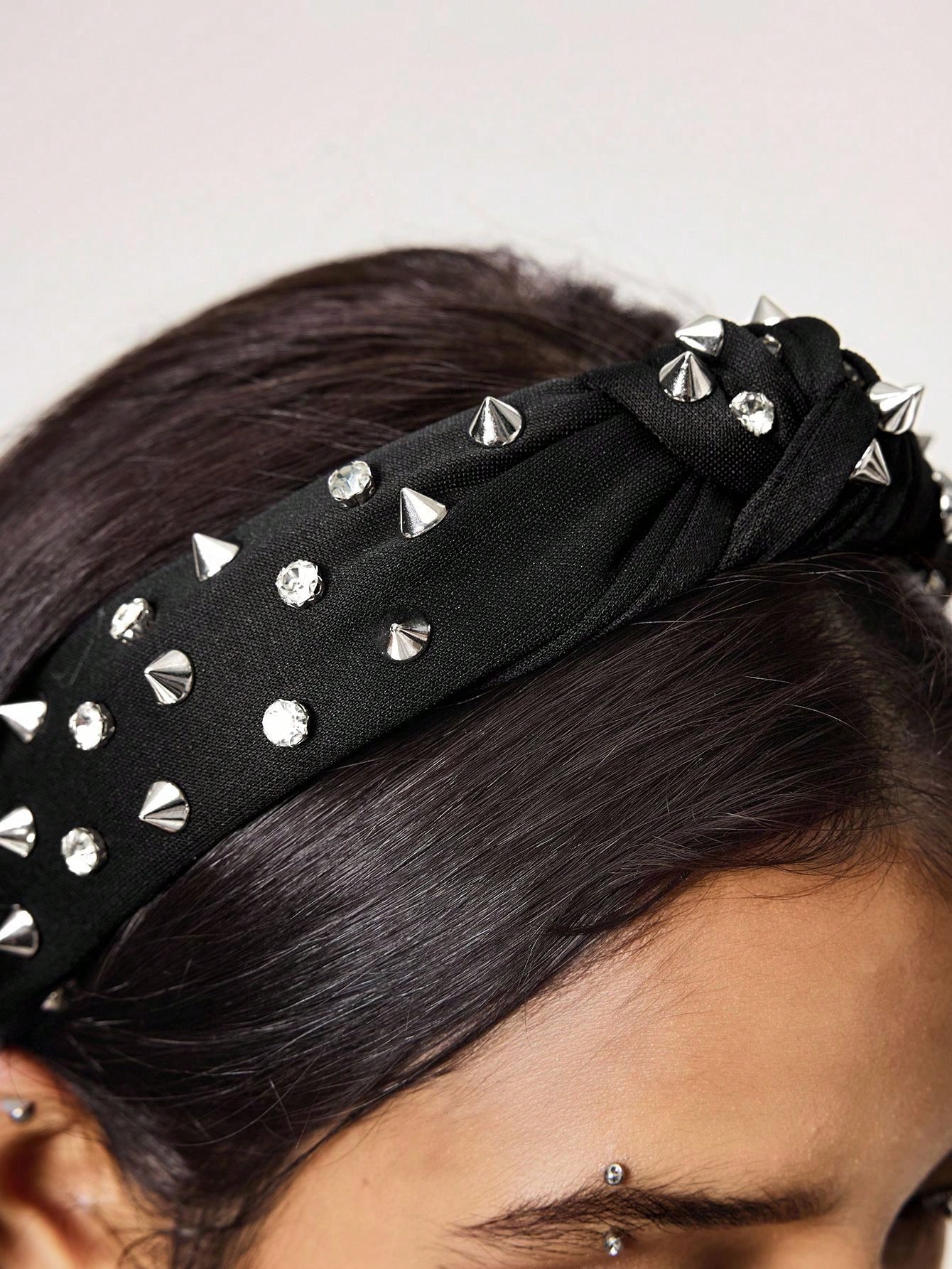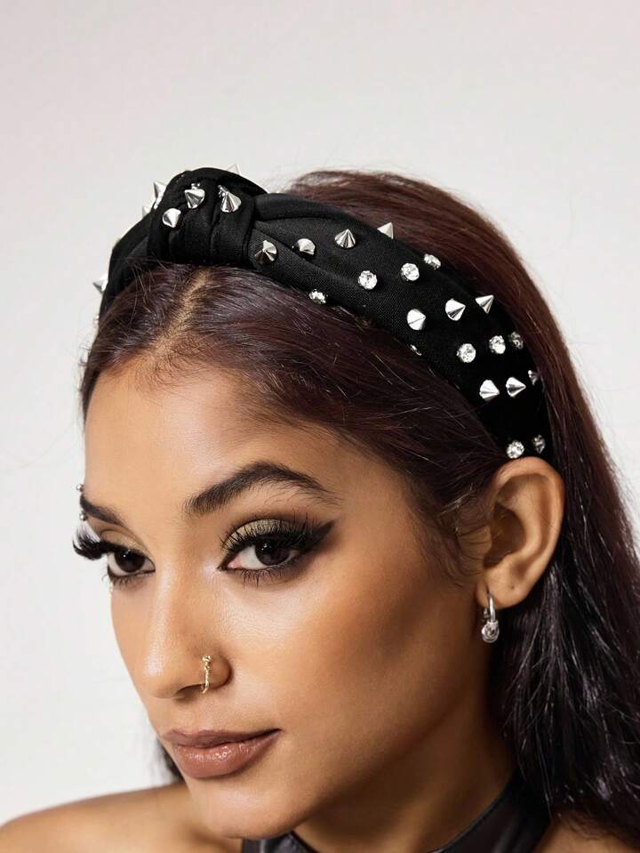 Grunge Punk 1pc Punk Style Rhinestone & Rivet Headband, Solid Black Y2K Pop Edgy Hairband, Niche Design Hair Accessories
