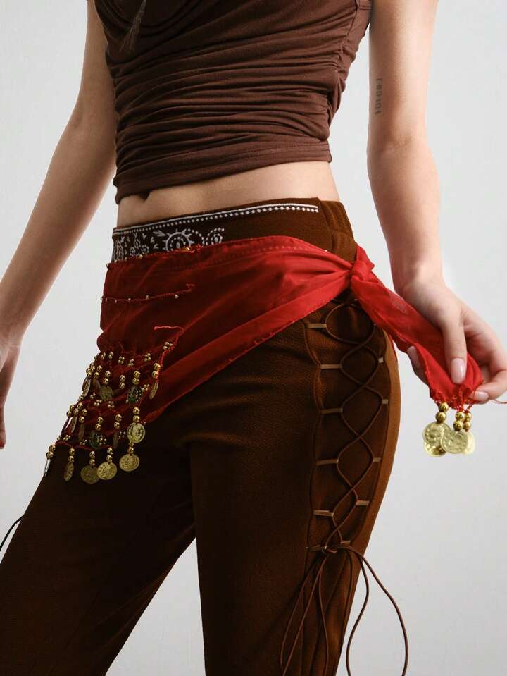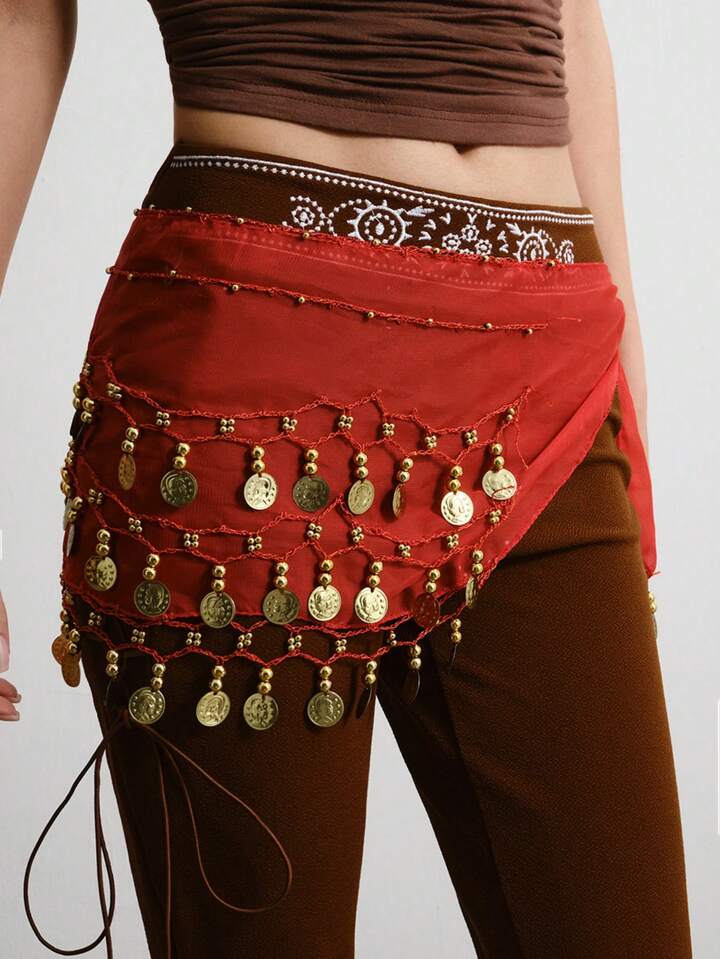 Grunge Punk 1pc Women's Red Mesh Fabric Gold Beads & Sequins Tassel Decoration Skirt, Glamorous Party/Queuing/Cosplay/Belly Dance Outfit, Versatile Daily Wear