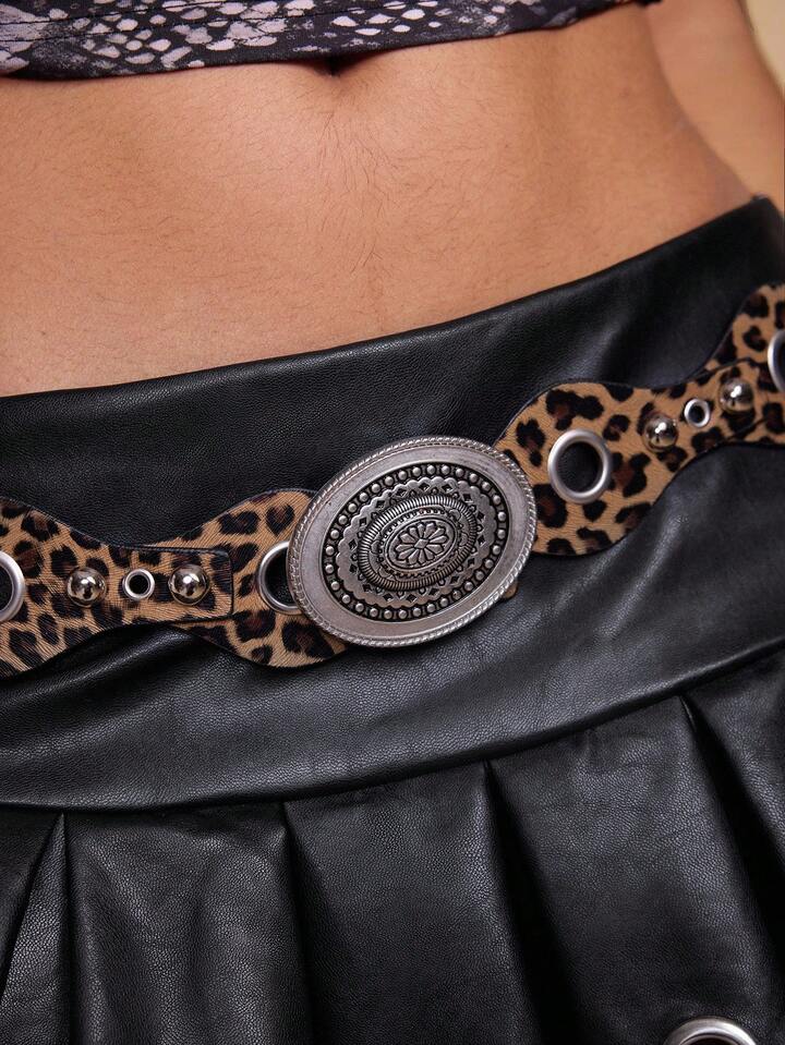 Grunge Punk 1pc Y2K Punk Style Leopard Print Metal Buckle Asymmetrical Women's Wide Waist Belt & Trouser Belt, Fashion Baddie Western Carved Leather Belt