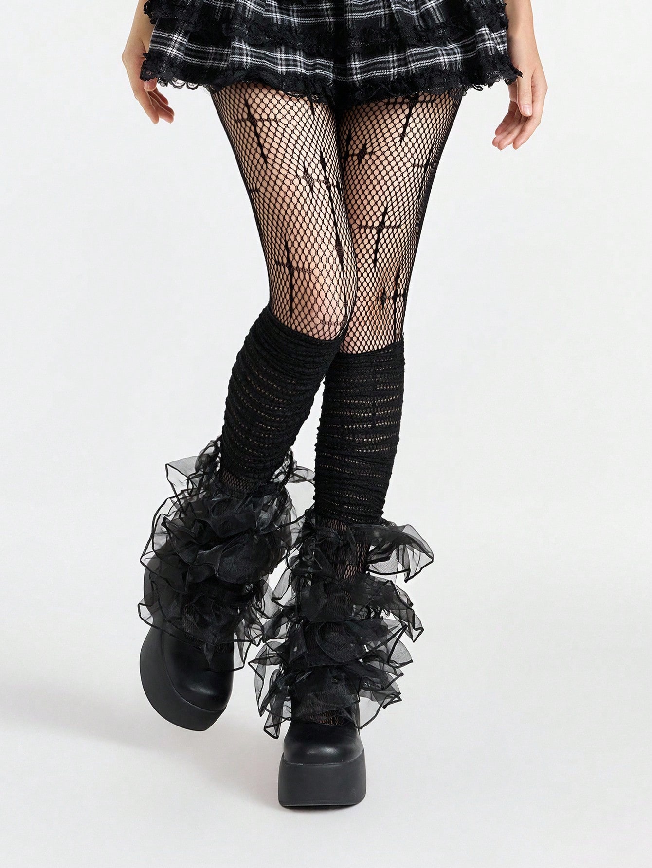 Grunge Punk 2 Pairs Y2K Punk Style Cross Net Stockings And Black Lace Panel Leg Warmers Set, Millennium Street Style Skirt Accessories, Thin Summer Layering, Fashionable Unique Skirt Decor