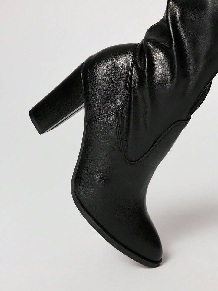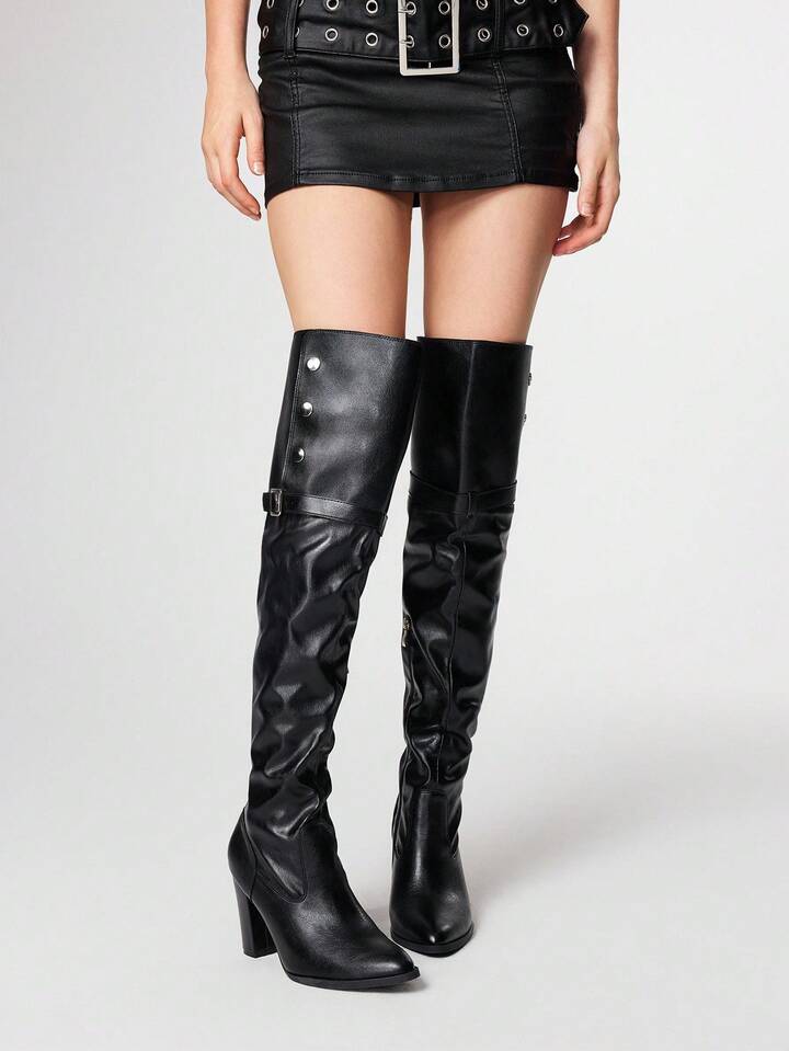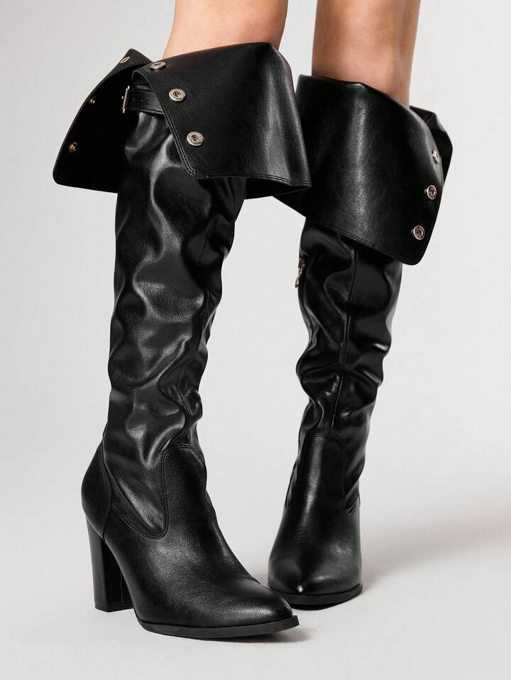 Grunge Punk 2025 Autumn/Winter New Pointed Toe High Heel Over-The-Knee Boots For Women, Versatile Thick Heel Buckle Strap Fold-Over Collar Tall Boots