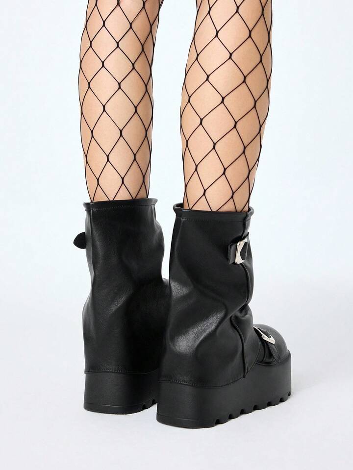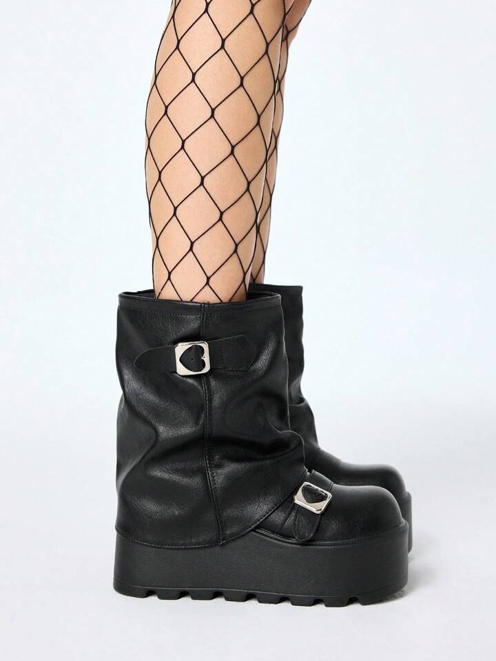 Grunge Punk 2025 Autumn/Winter New Round Toe Thick Sole Punk Style Buckle Strap Pants Leg Boots, Leather Outdoor Fashion Slip-On Mid-Calf Boots
