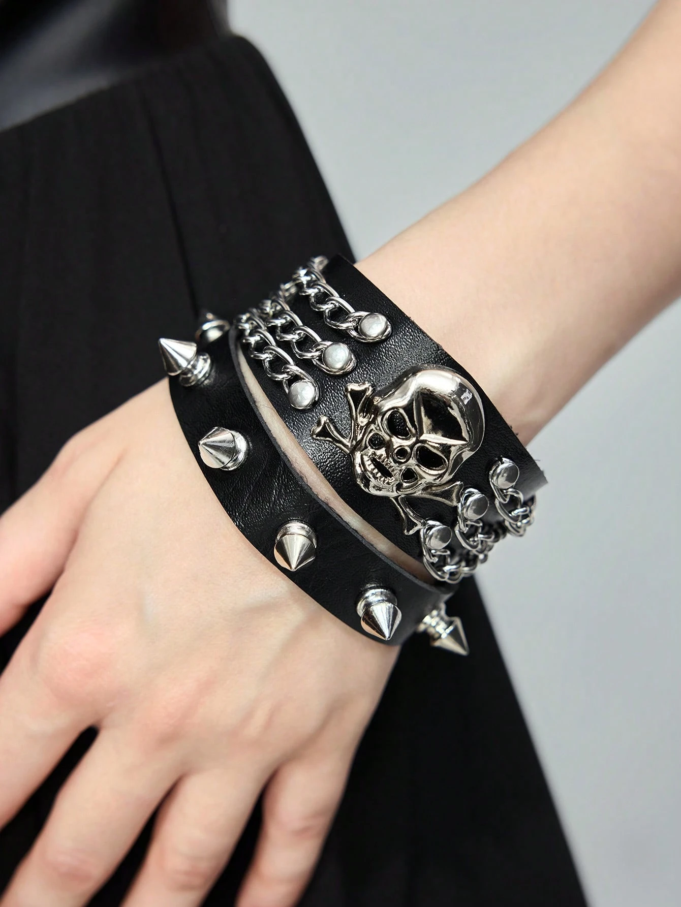 Grunge Punk 2pcs Punk Studded Chain Wristband Bracelets, Gothic Hip-Hop Style Wrist Decorations
