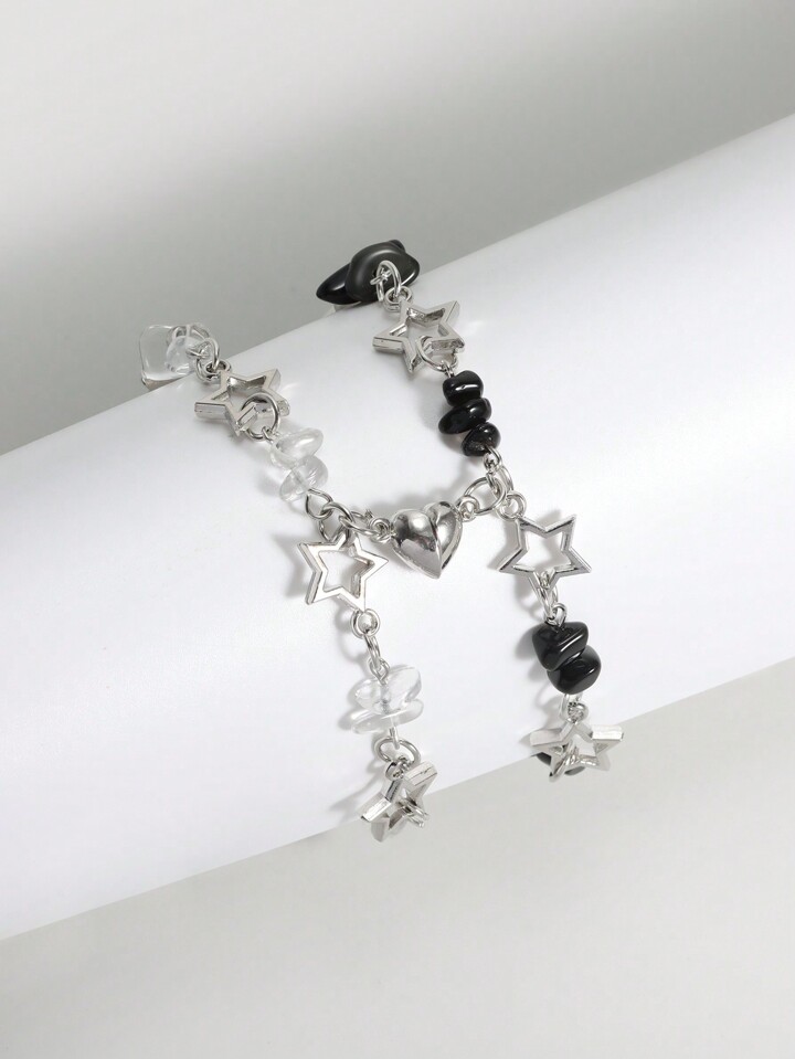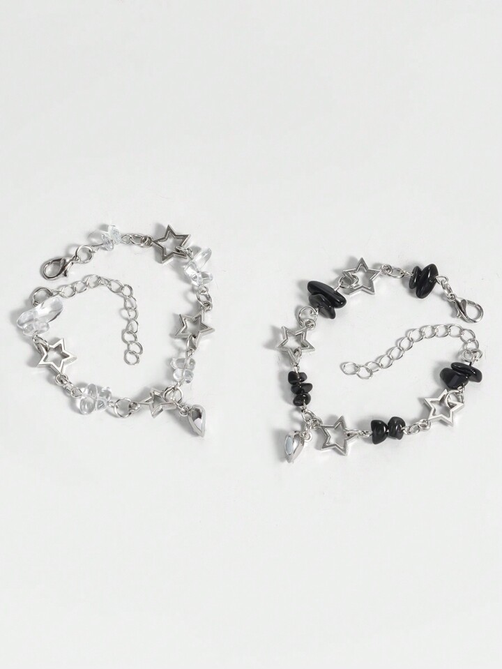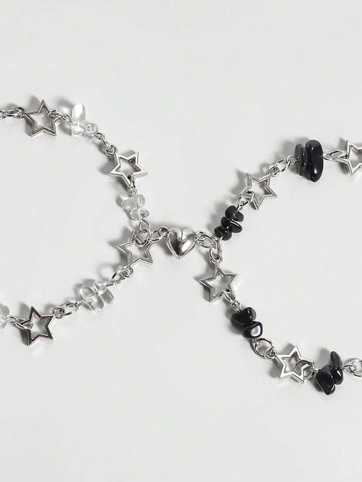 Grunge Punk 2pcs Punk Style Black And White Crystal Star Bracelet Set, Silver Jewelry Suitable For Daily Wear, Valentine's Day Gift, Friendship Matching Bracelet,Mom,Mother,Mother's Day,Gift