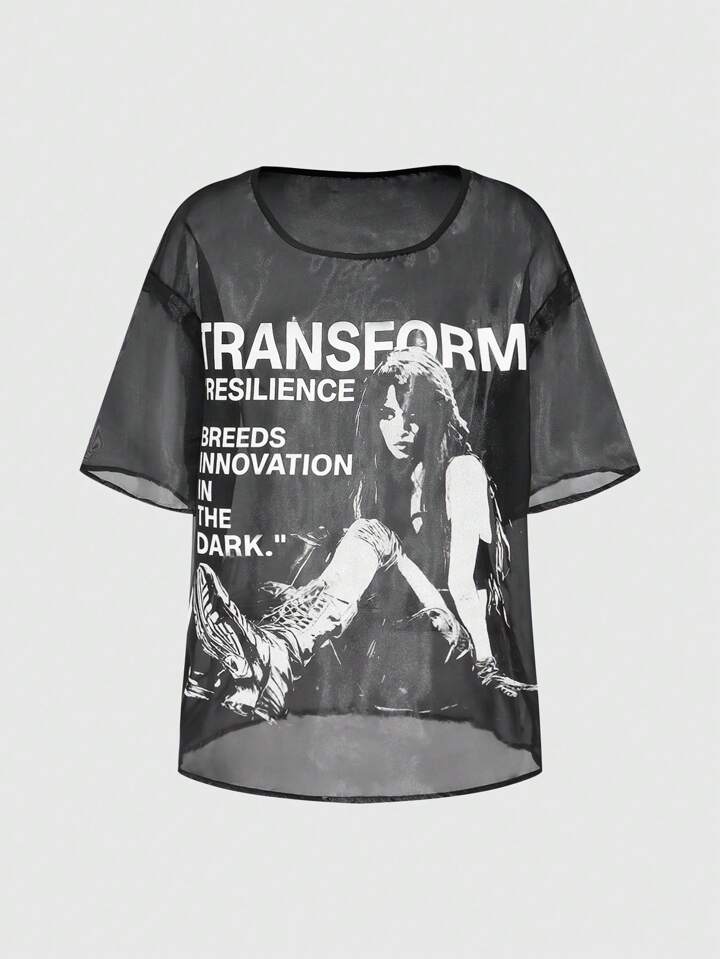 Grunge Punk 2pcs/Set Women Summer Slogan & Portrait Graphic Short Sleeve T-Shirt With Solid Crew Neck Tee