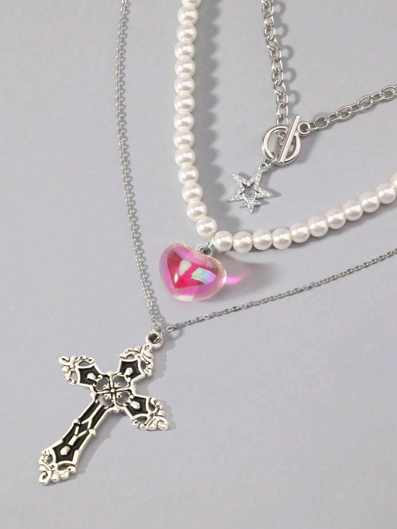 Grunge Punk 3pcs Gothic Style Black Beaded, Red Thorn Rose, Cross & Heart Pendant Necklace Set For Women