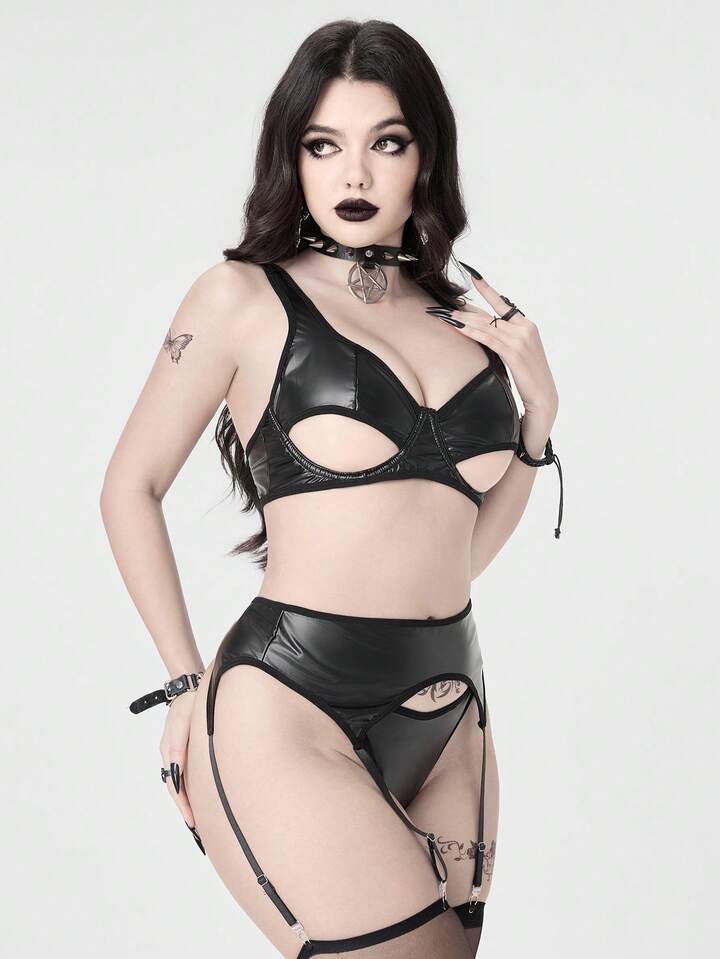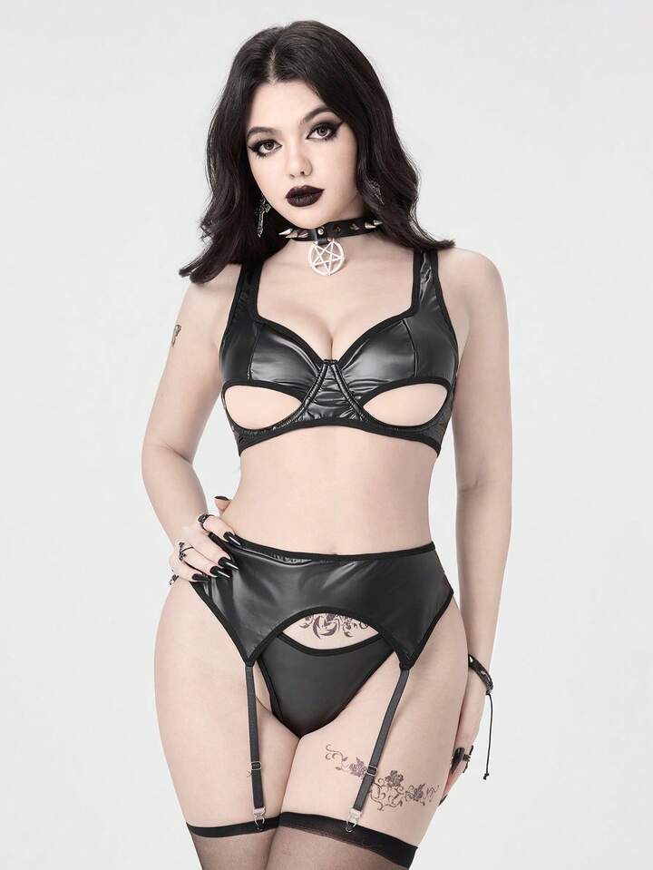 Grunge Punk 3pcs Punk Hollow-Out Bra, Thong, And Garter Belt Sexy Lingerie Set