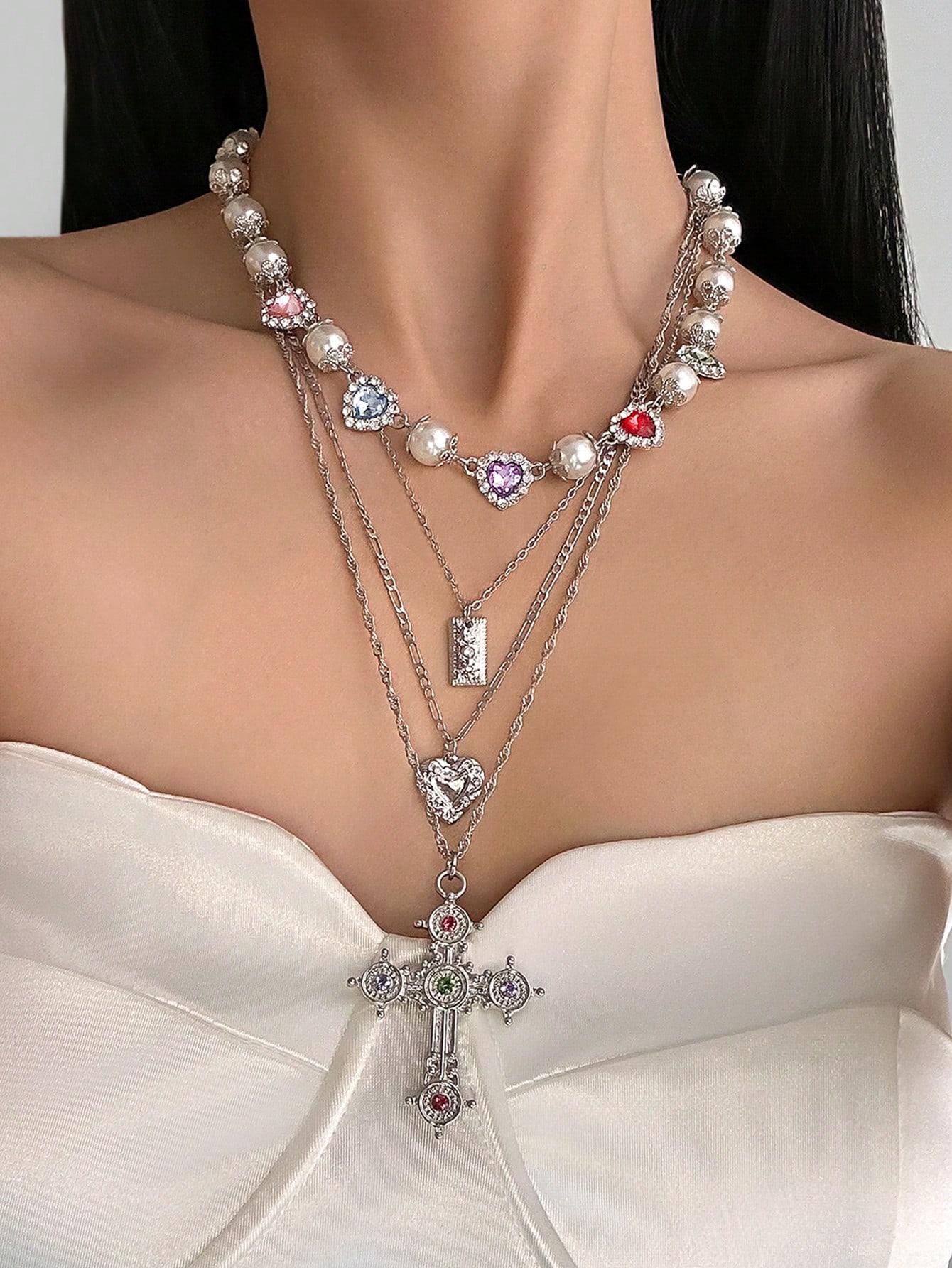 Grunge Punk 4pcs Set Vintage Simple Rhinestone & Faux Pearl Necklace, Gold Cross Pendant Choker Necklace For Women & Couples