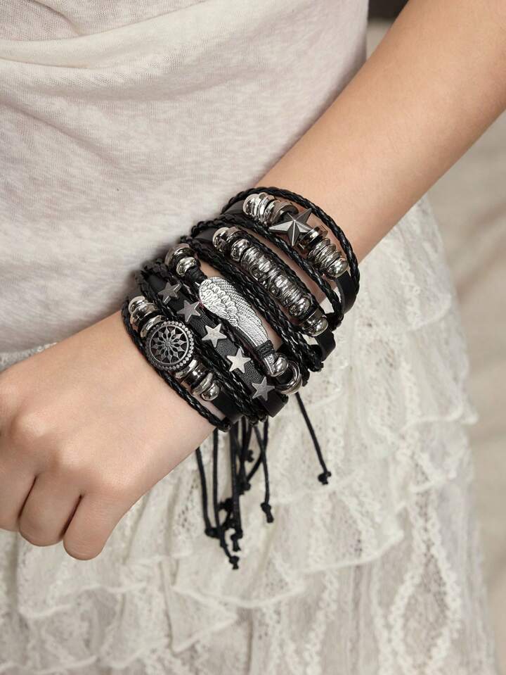 Grunge Punk 5pcs/Set Retro Hippie Style Pentagram Beaded Wing PU Leather Bracelets For Women, Suitable For Daily Wear And Festivals