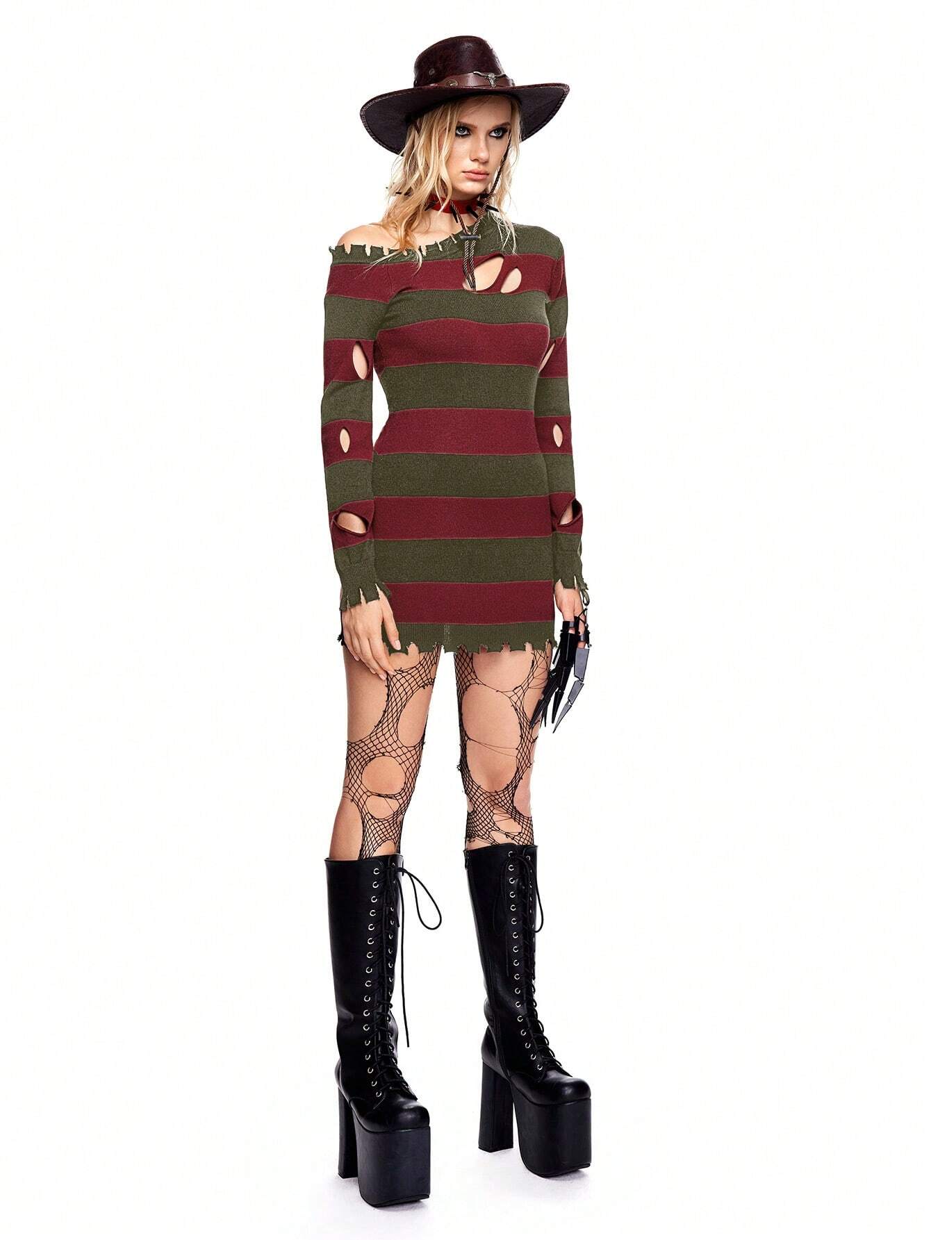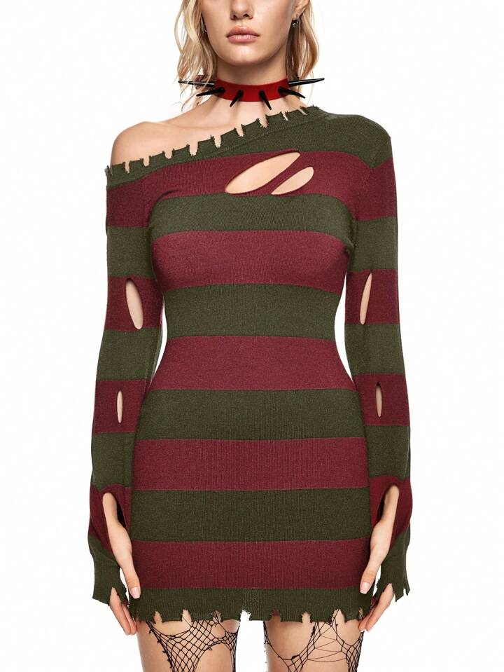Grunge Punk Asymmetric Neckline Oversized Striped Ripped Long Pullover Sweater, Fashionable For Autumn