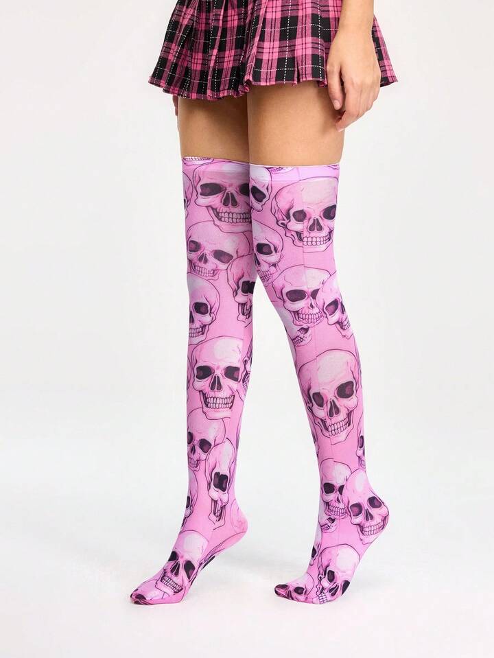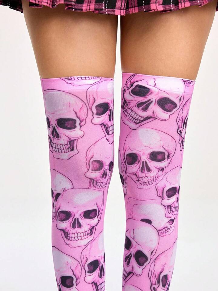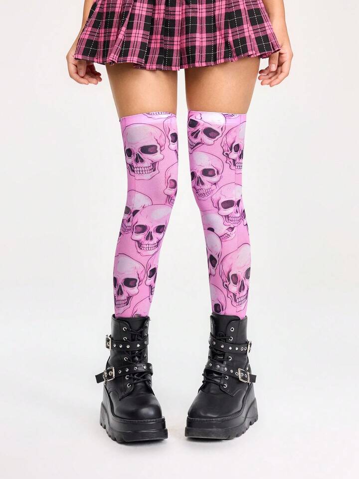 Grunge Punk Asymmetrical Skull Print Long Over-The-Knee Socks, Sweet Gothic Lolita Versatile Fashion Party Stockings, Halloween