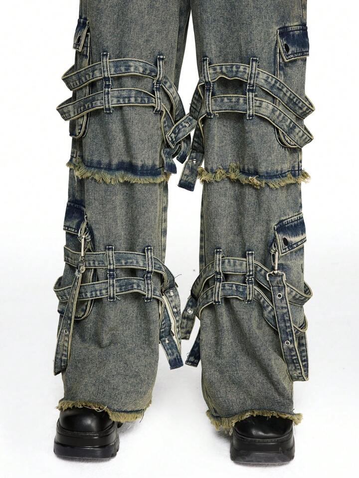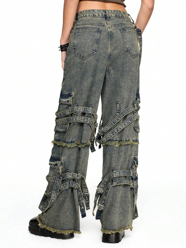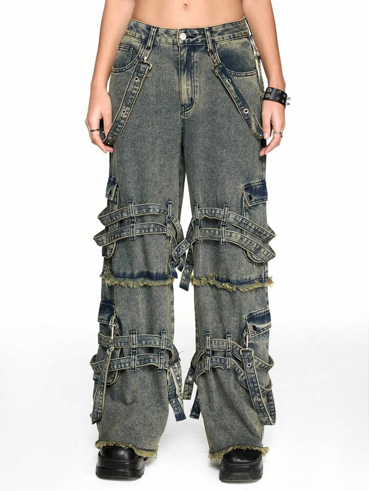 Grunge Punk Casual Street Punk Chic Strap Metal Belt Decoration Women Wide Leg Loose Denim Jeans Pants, Summer Outfits
