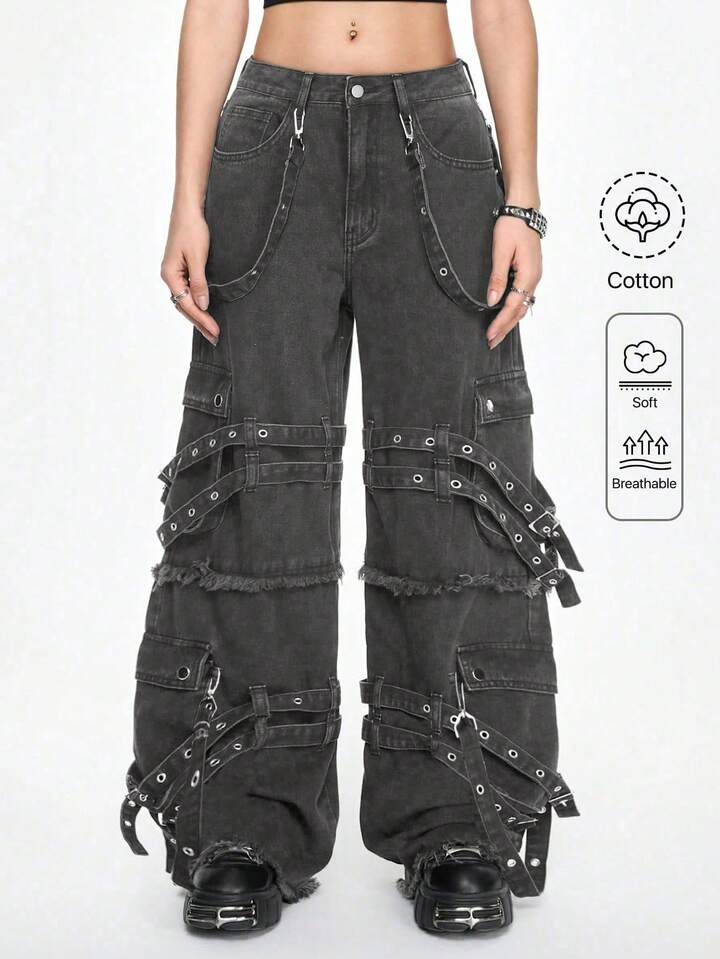 Grunge Punk Casual Street Punk Ribbon Metal Webbing Decor Women's Wide Leg Denim Pants