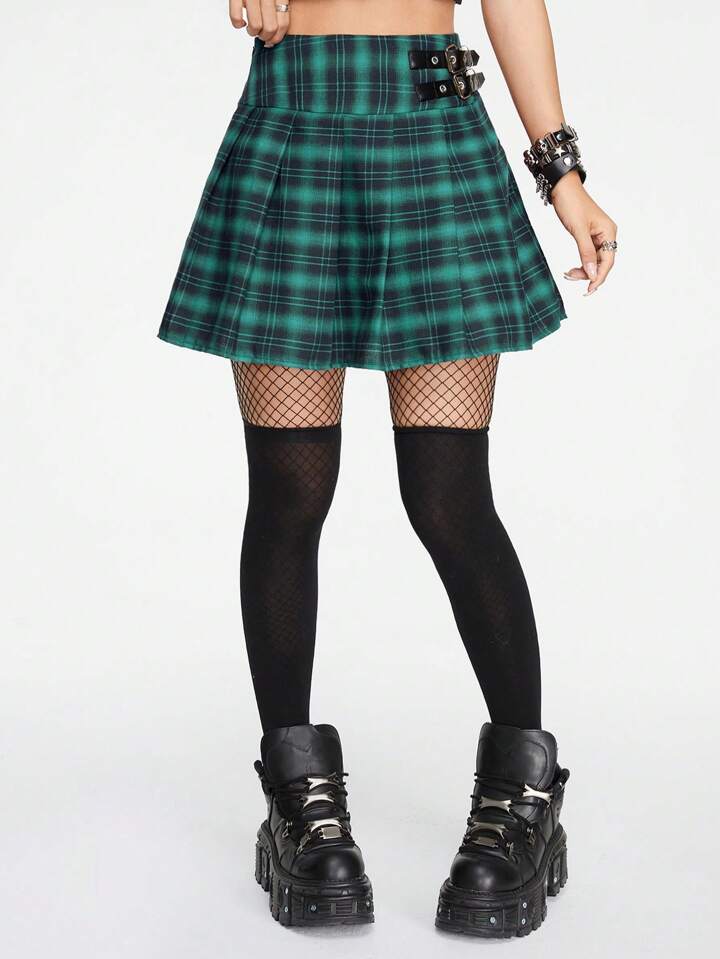 Grunge Punk Collegiate Style Green Plaid Patchwork PU Leather Button Closure Summer A-Line Skirt