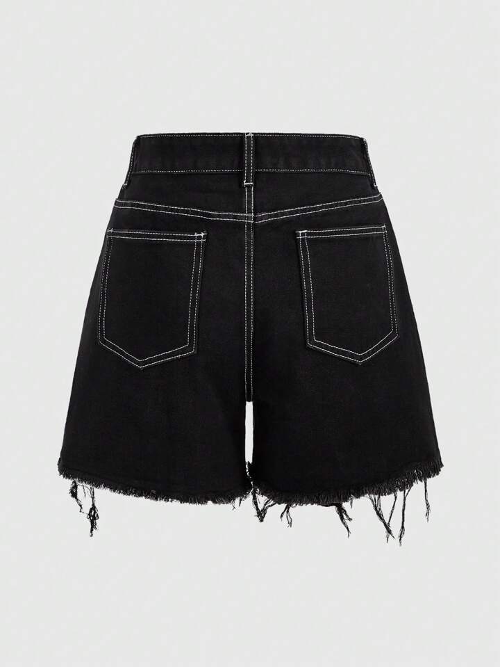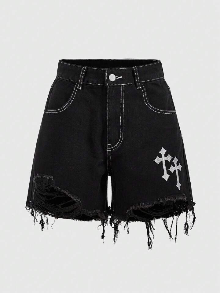 Grunge Punk Cross Print Distressed Raw Hem Denim Shorts