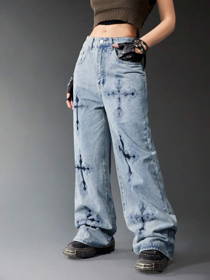 Grunge Punk Cross Print Wide Leg Jeans