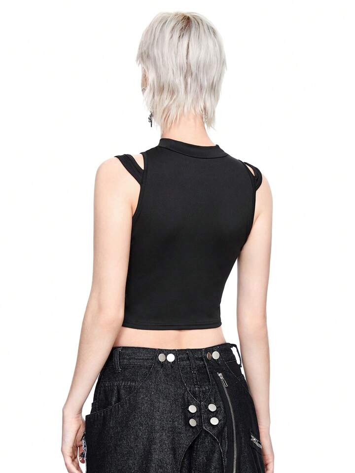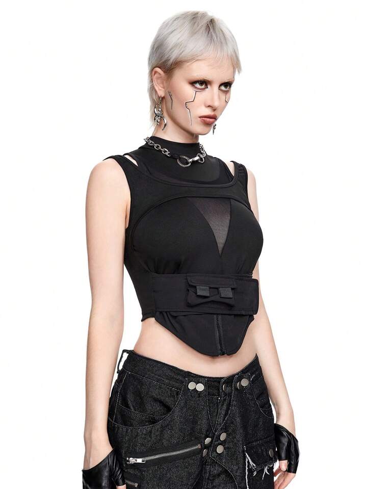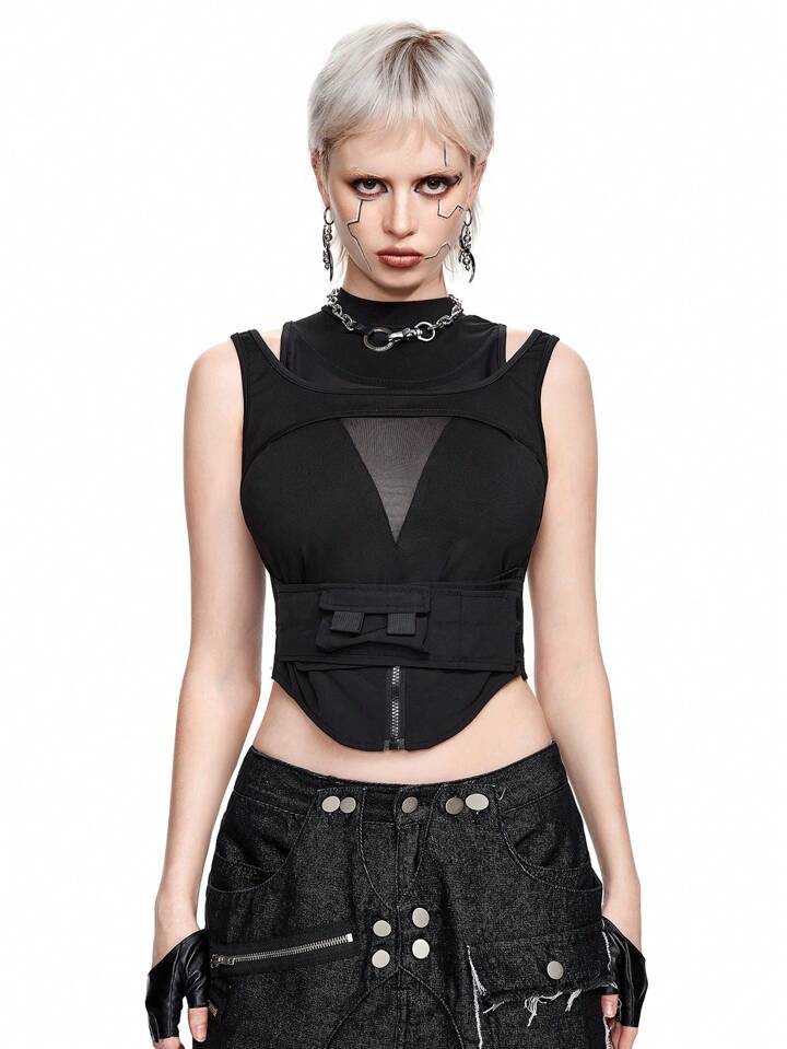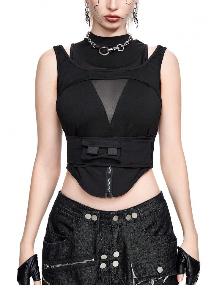 Grunge Punk Cyberpunk Style Cargo Pocket Cutout Patchwork Bodycon Tank Top For Women