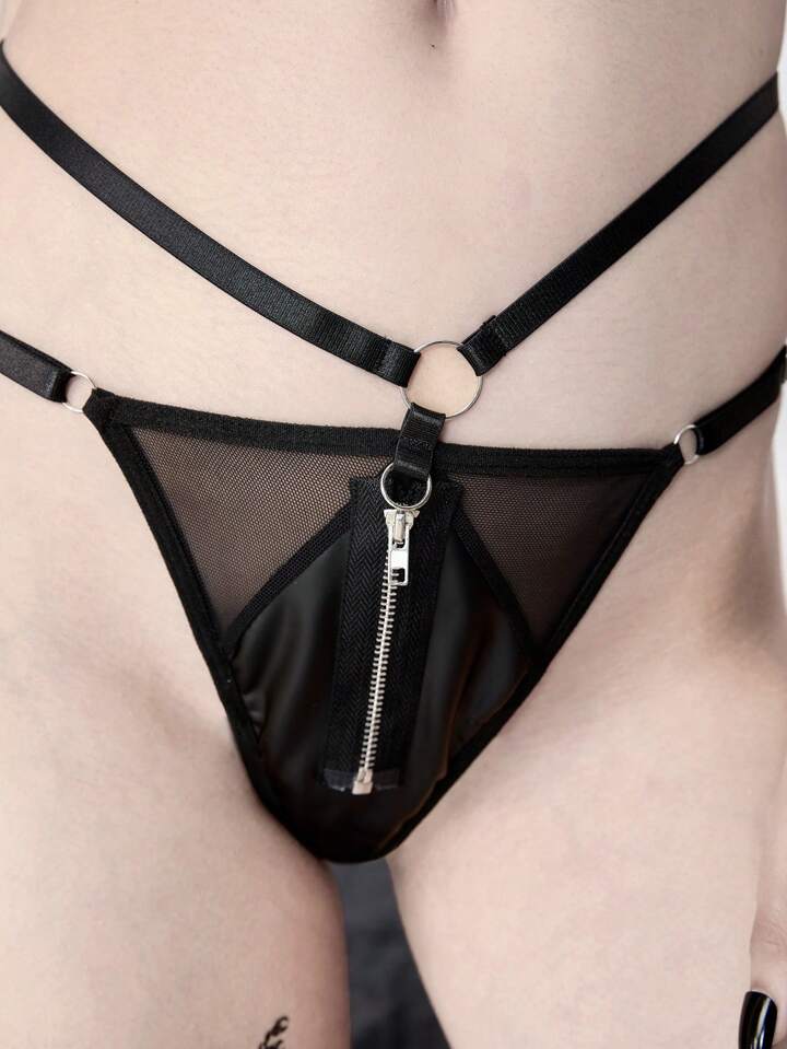 Grunge Punk Dark Punk Faux Zipper PU Mesh Crotchless Panty