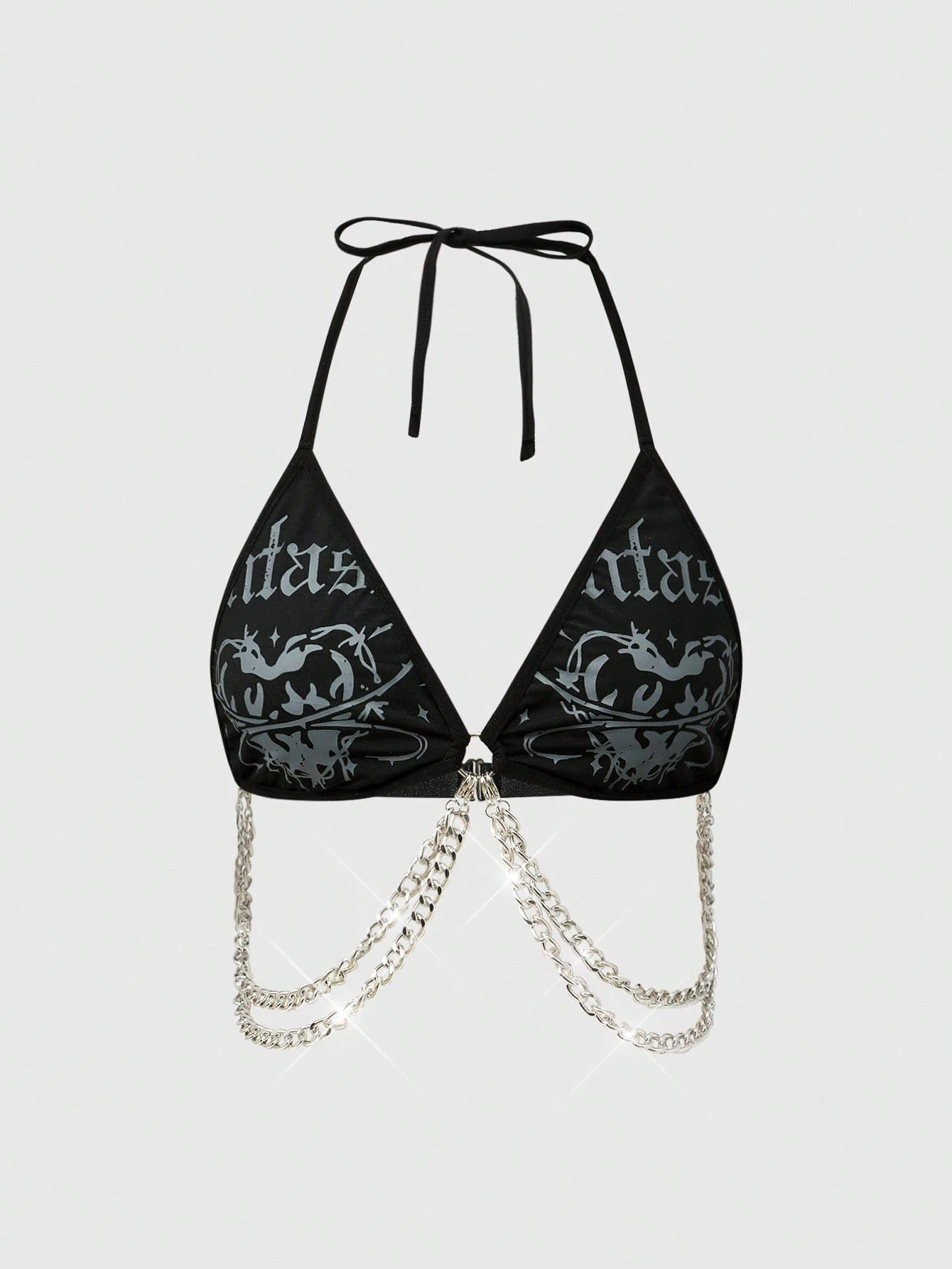 Grunge Punk Dark Punk Gothic Alphabet With Thorn Heart Triangle Crop Top With Chain Decor