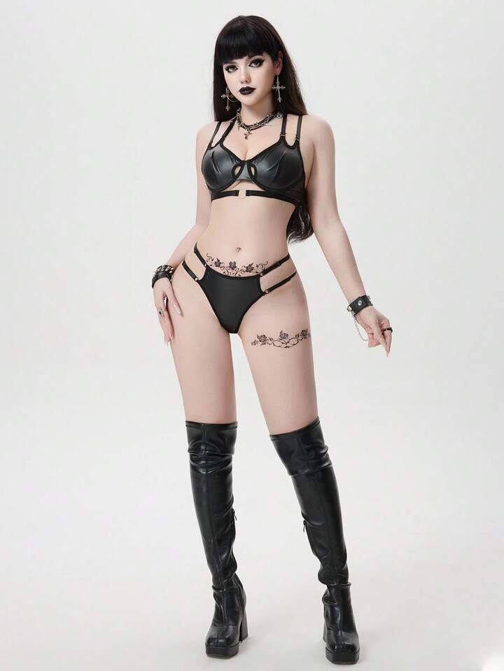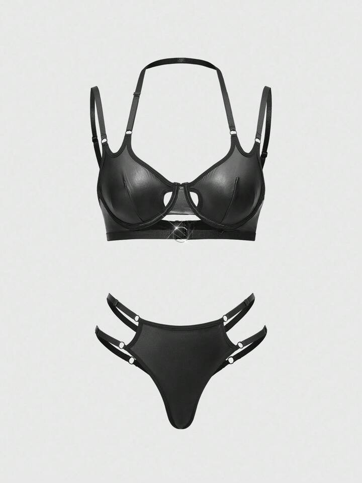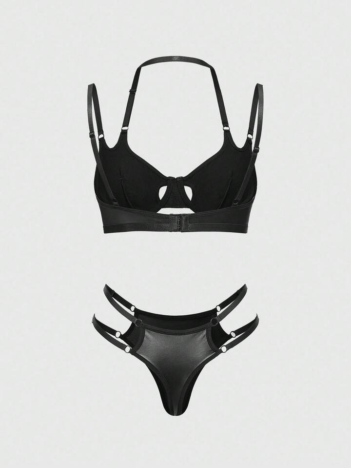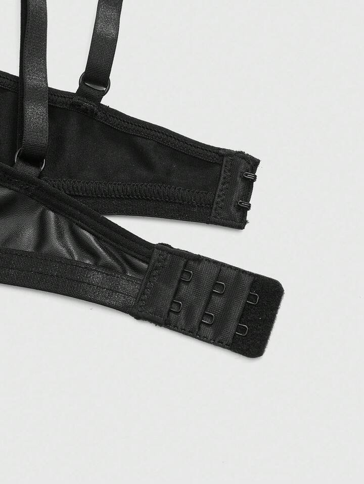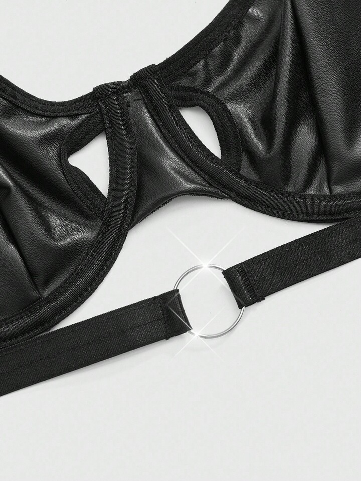 Grunge Punk Dark Punk PU Material Underwire Bra & G-String Sexy Lingerie Set