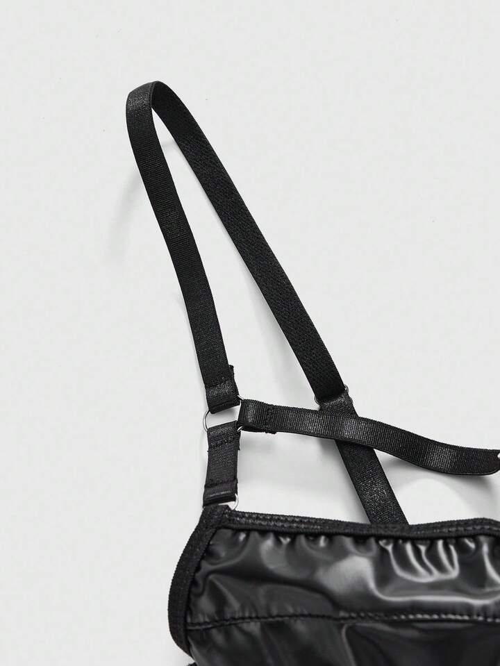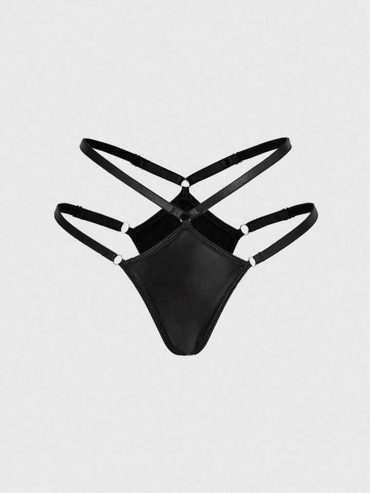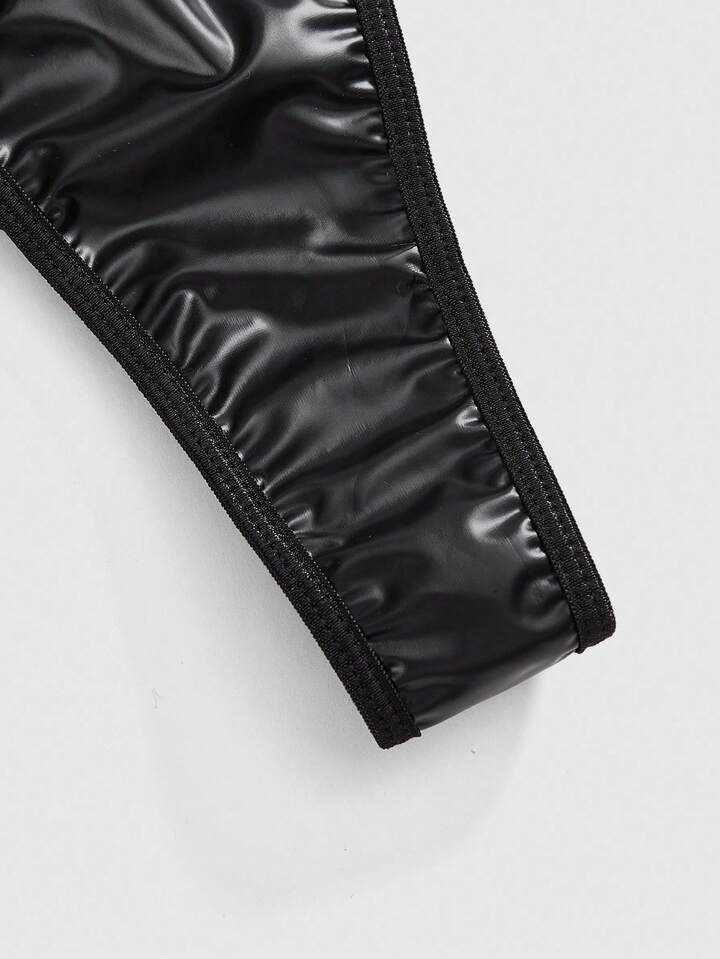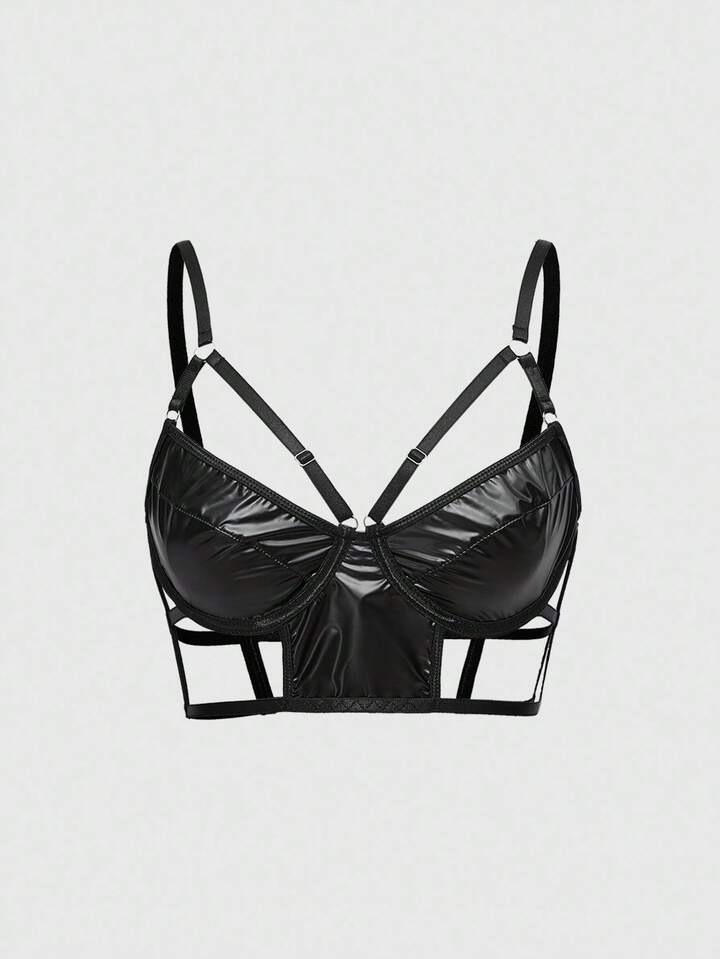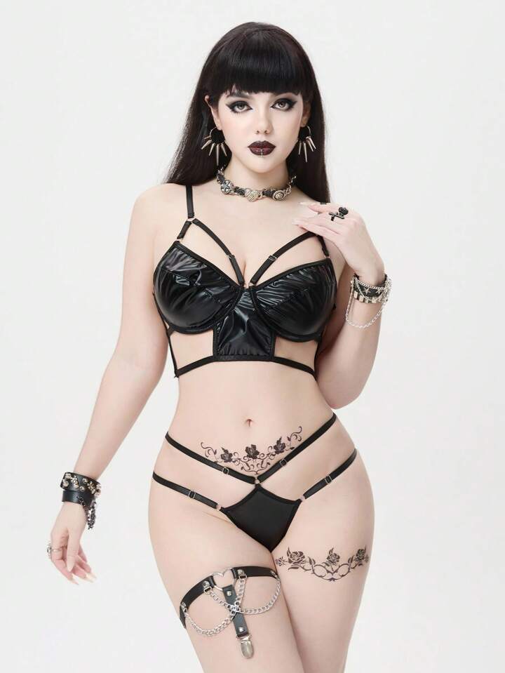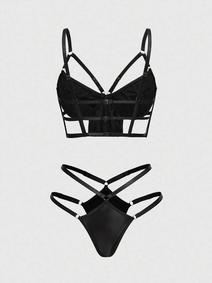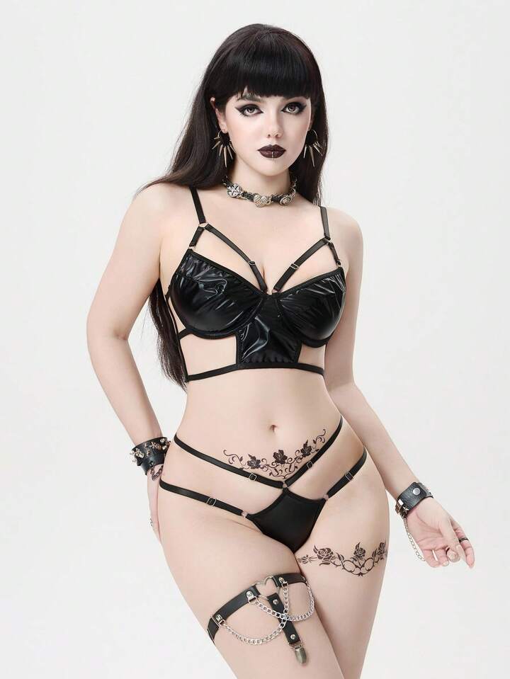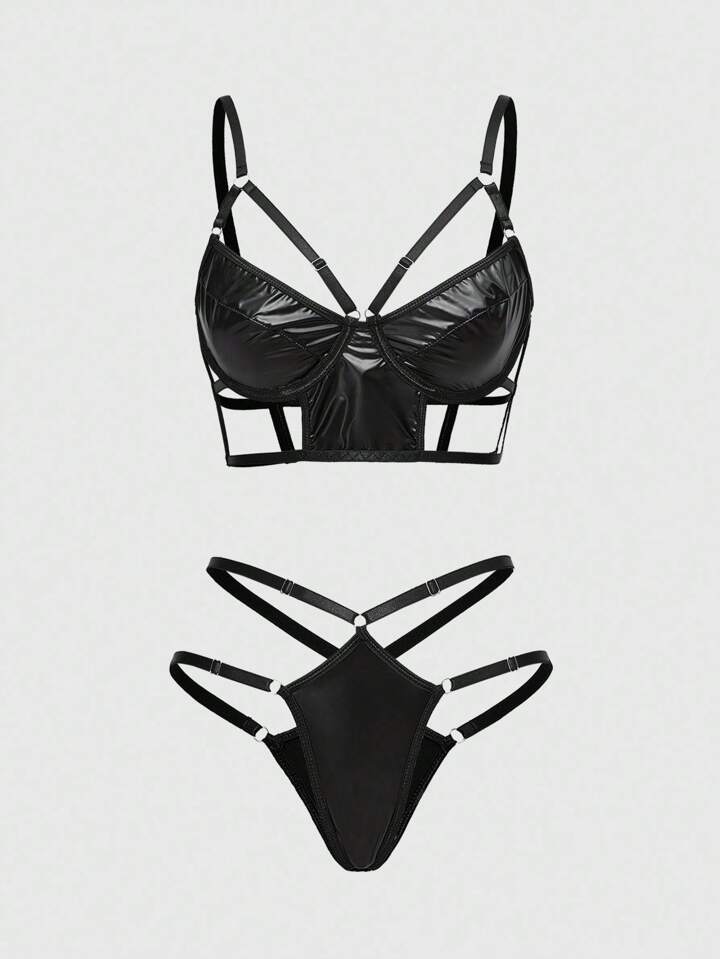 Grunge Punk Dark Punk PU Underwire Bra And Thong Lingerie Set, Sexy