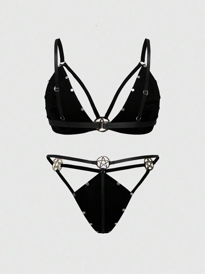 Grunge Punk Dark Punk Rivets & Pentagram Metal Decor Plus Size Sexy Lingerie Set, Wireless