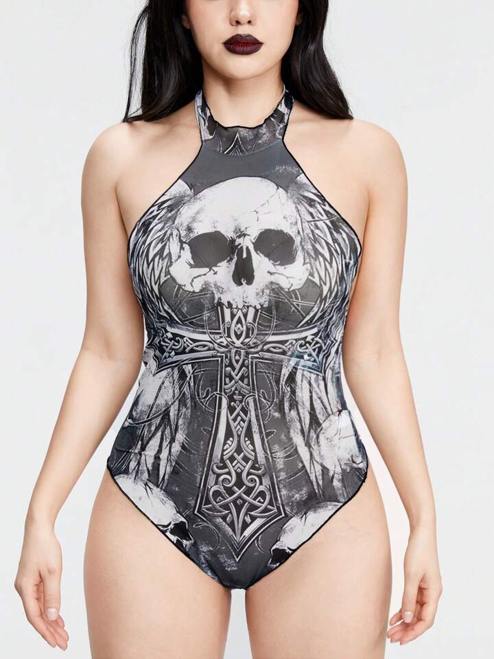 Grunge Punk Dark Punk Skull & Mesh Print Halterneck Bodysuit