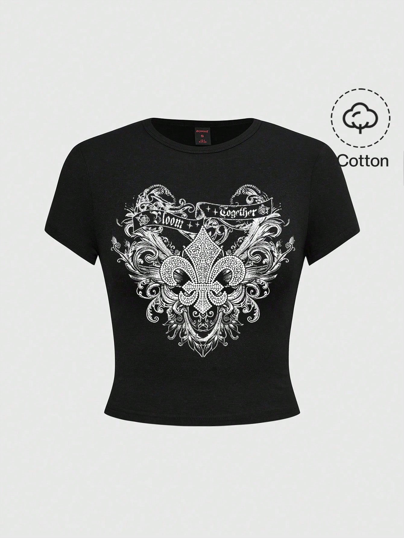 Grunge Punk Dark Punk Wing & Rhinestone Print Black T-Shirt For Women