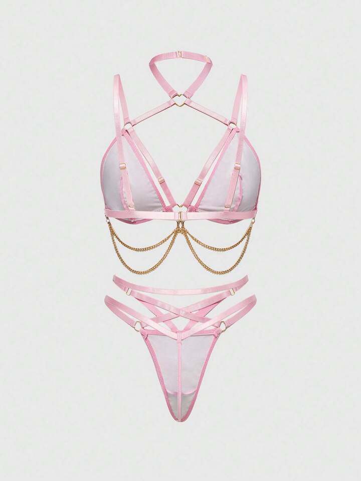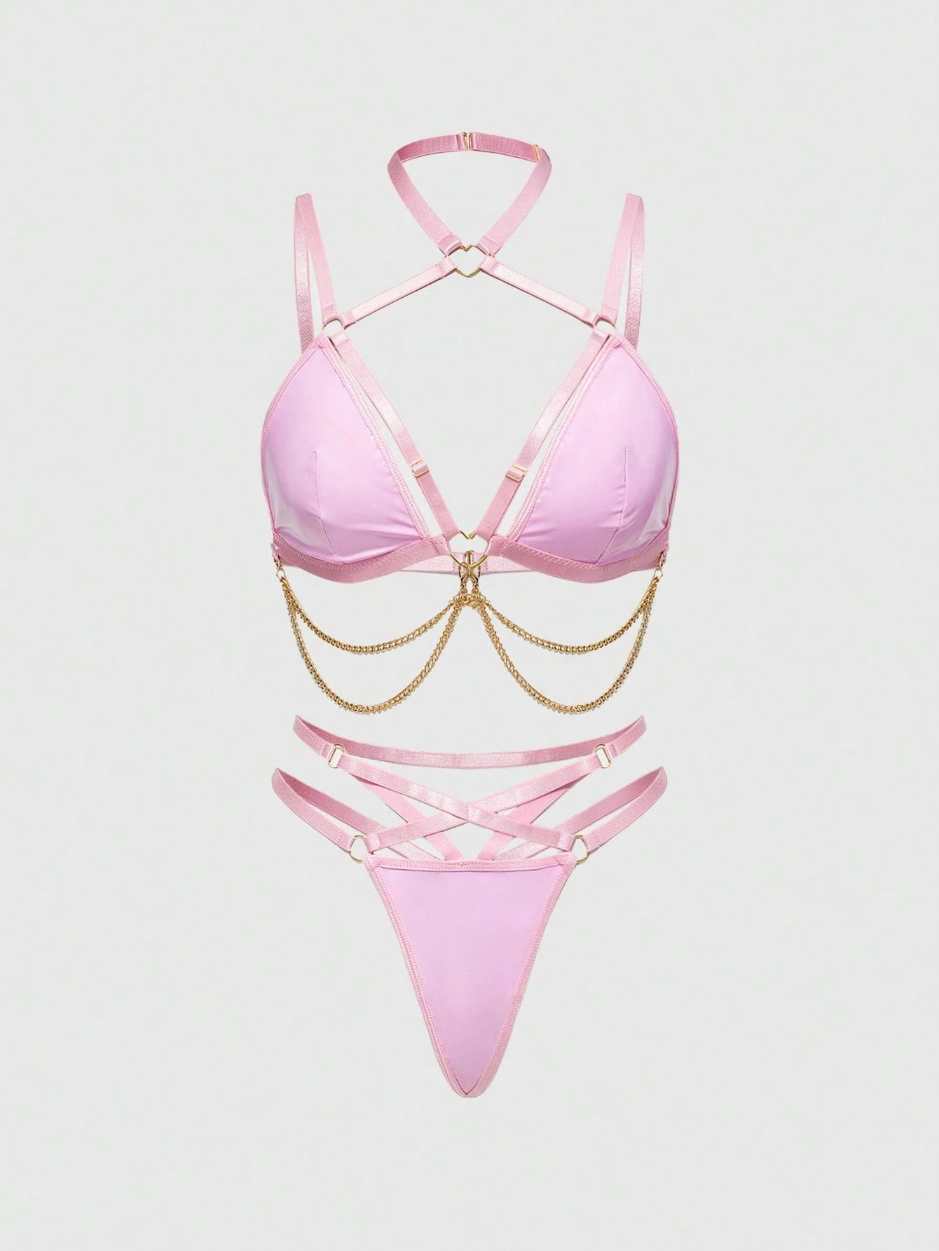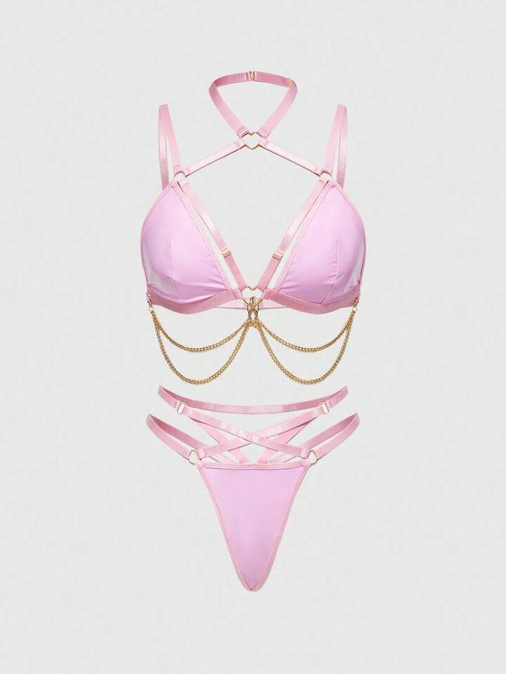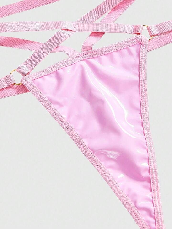 Grunge Punk Dark Street Punk Pink Punk PU Triangle Cup Bra & Thong Sexy Lingerie Set