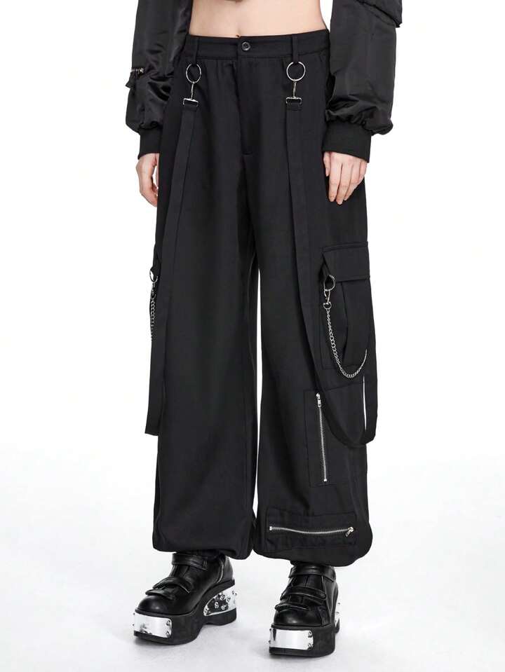 Grunge Punk Detachable Strap Pocket Metal Zipper Casual Cargo Pants