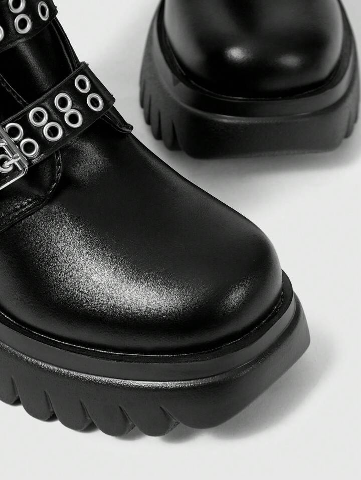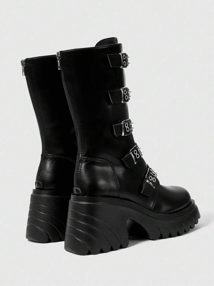 Grunge Punk European & American Style Black Leather Platform Boots, Gothic Boots With Thick Soles, Belt Buckle, Rivets, Punk Rock High Top Boots, Women Chunky Heeled Mid-Calf Boots New Year Holiday