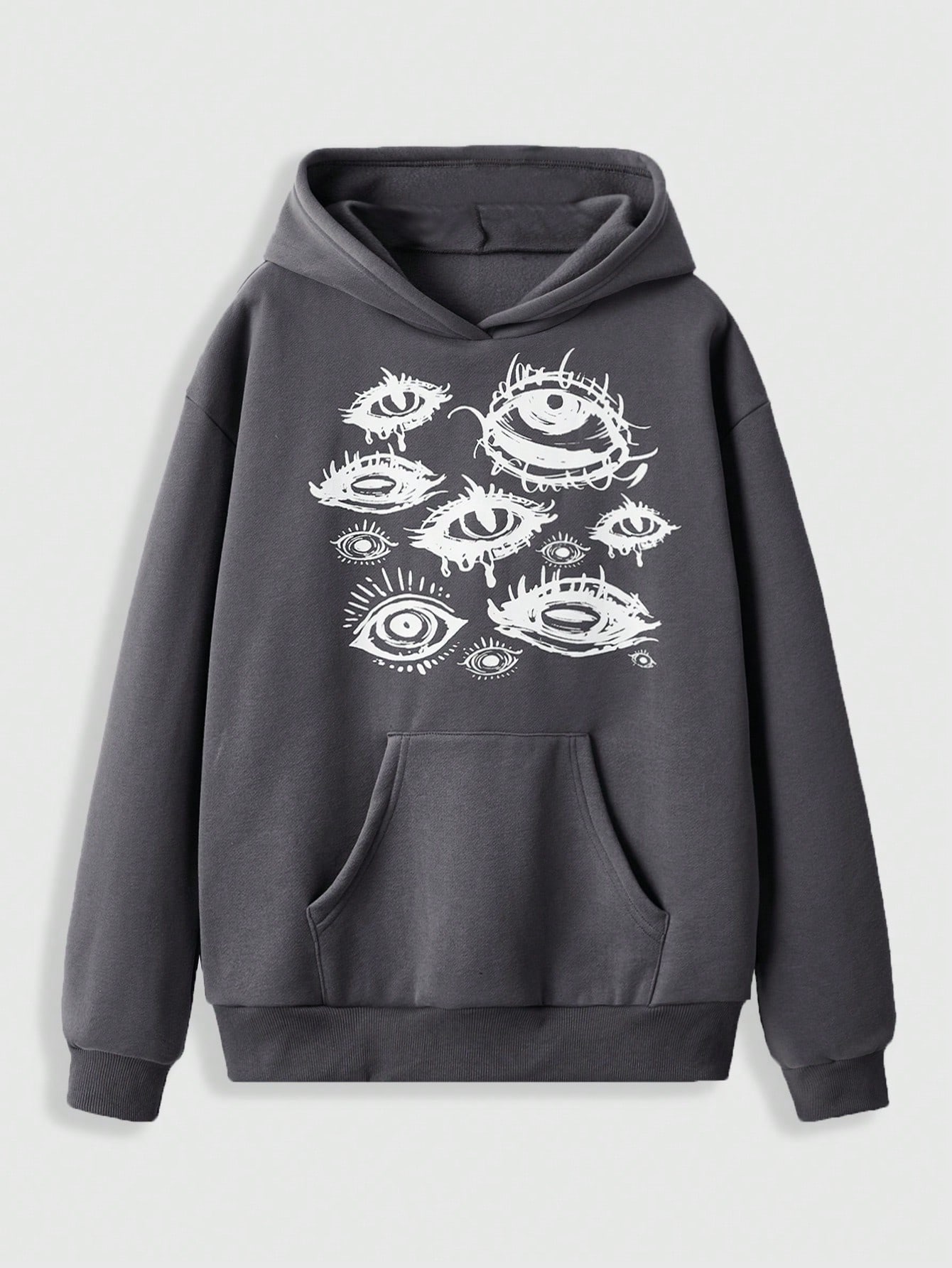 Grunge Punk Eye Print Kangaroo Pocket Drop Shoulder Thermal Hoodie