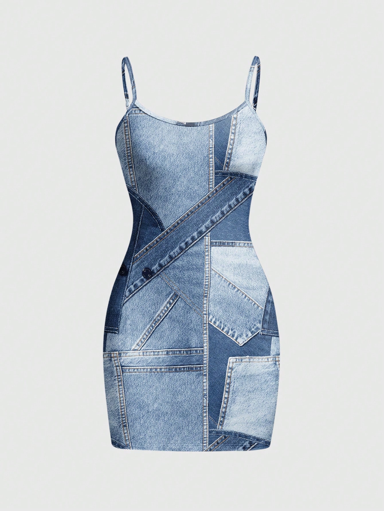 Grunge Punk Faux Denim Print Fabric Sexy Retro Grunge Print Camisole Bodycon Mini Dress For Women