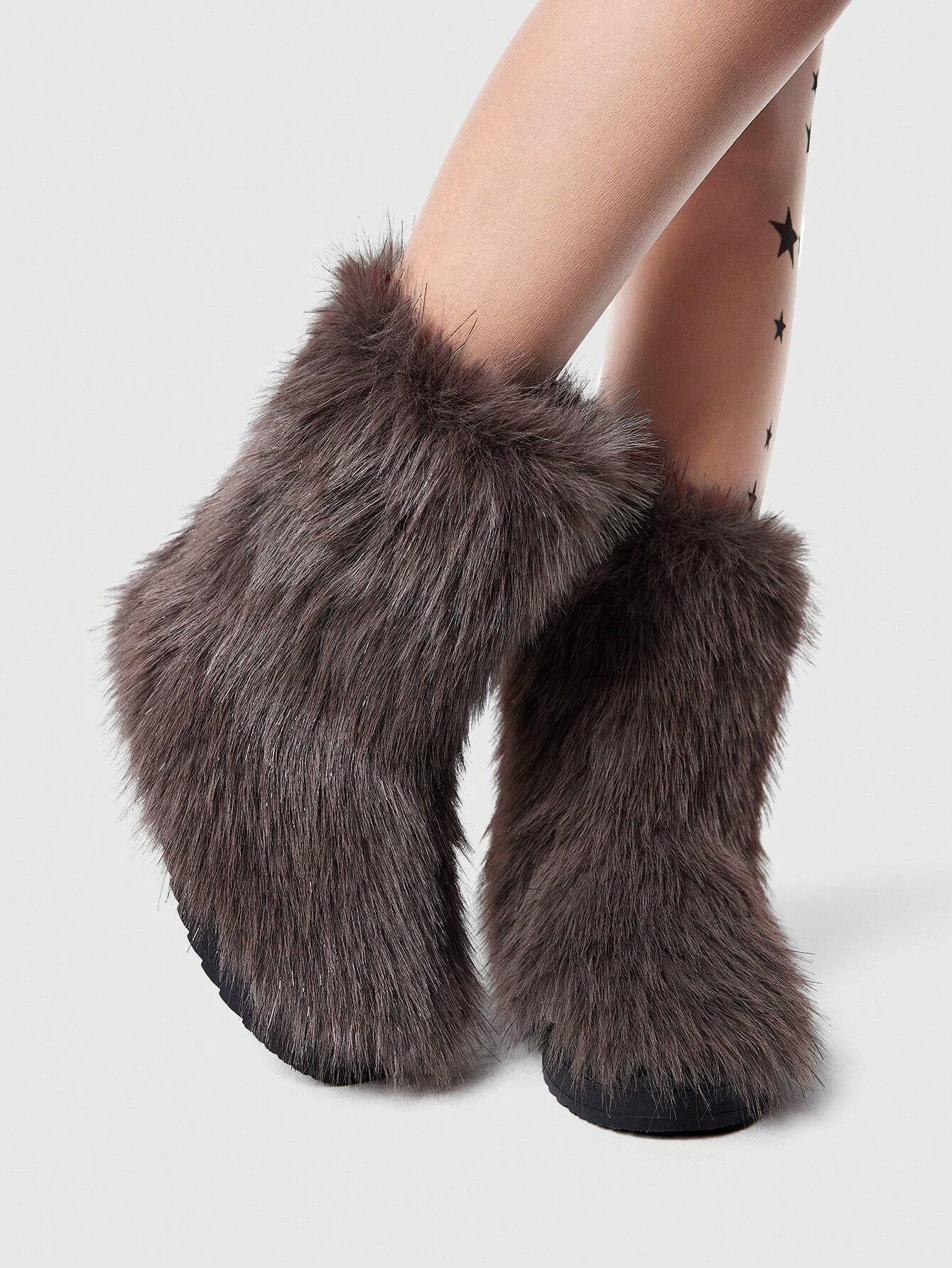 Grunge Punk Furry Thicken Snow Fuzzy Boots For Women, 2024 New Winter Plush Lined Warm Boots, Flat Non-Slip Short Shaft Snow Boots For Christmas And New Year Holiday Vibe Fall And Winter