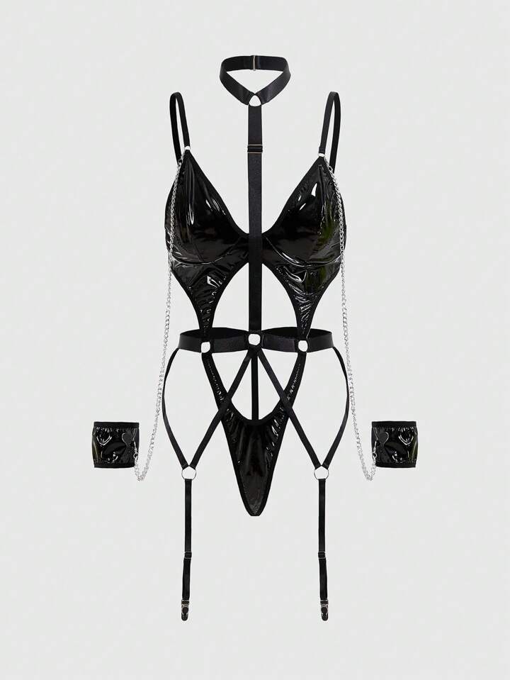 Grunge Punk Goth Ring Linked Chain Detail Harness Garter Teddy Bodysuit With 1pair Leg Ring, Lingerie
