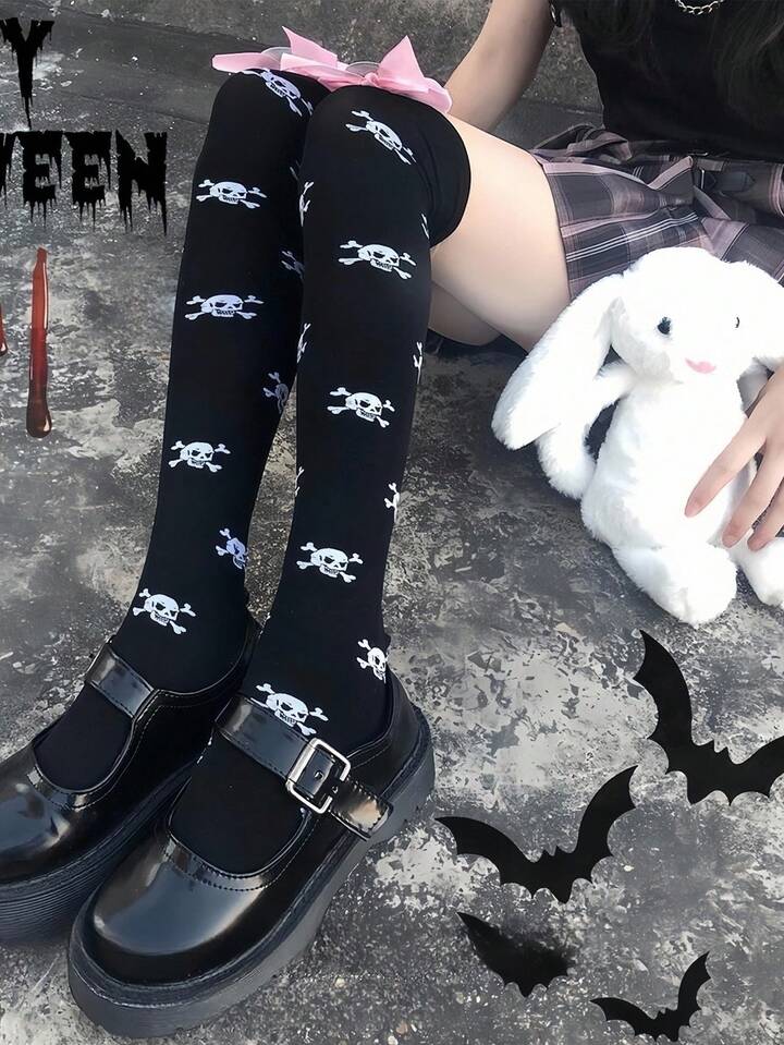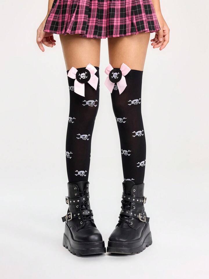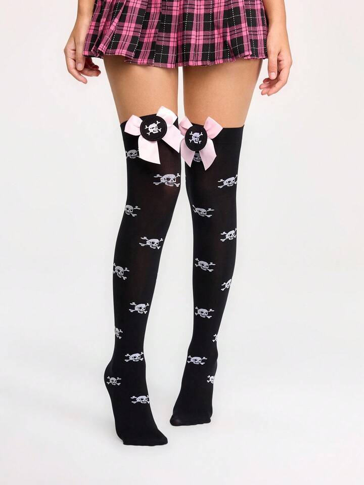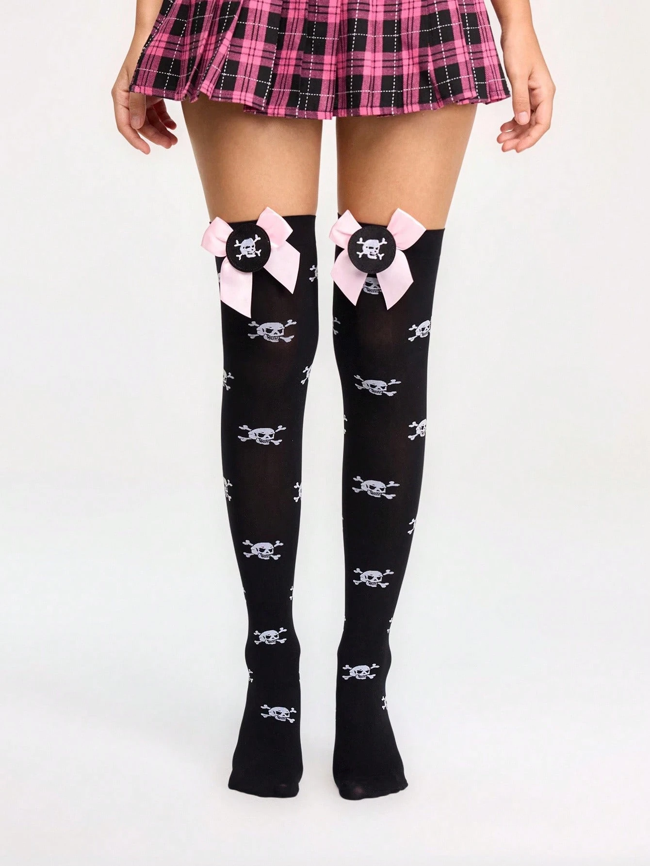 Grunge Punk Gothic Skull Print Bowknot Over-The-Knee Socks, Y2K Punk Street Style Fashion Thigh High Socks Suitable For Party, Gathering, Social Occasions, Halloween