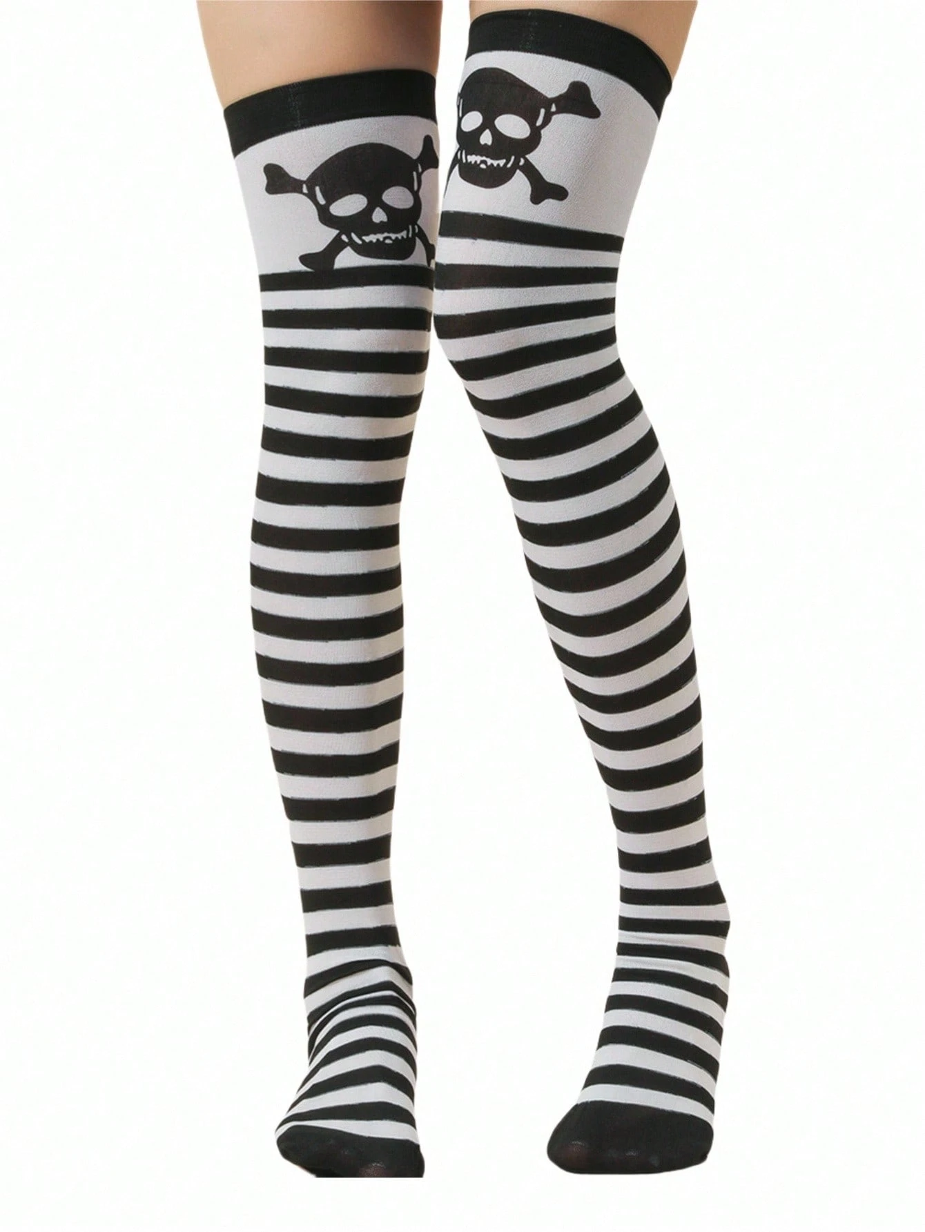 Grunge Punk Gothic Style Black & White Striped Skull Print Thigh High Socks, Y2K Punk Street-Wear Fashion, Suitable For Parties, Gatherings, Social Events, Halloween