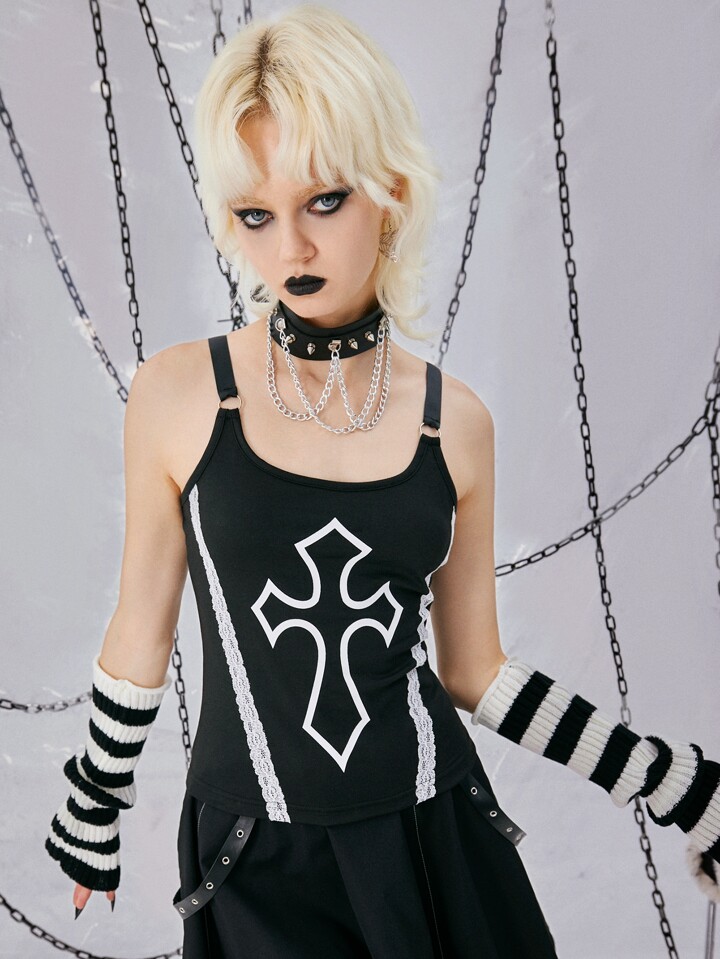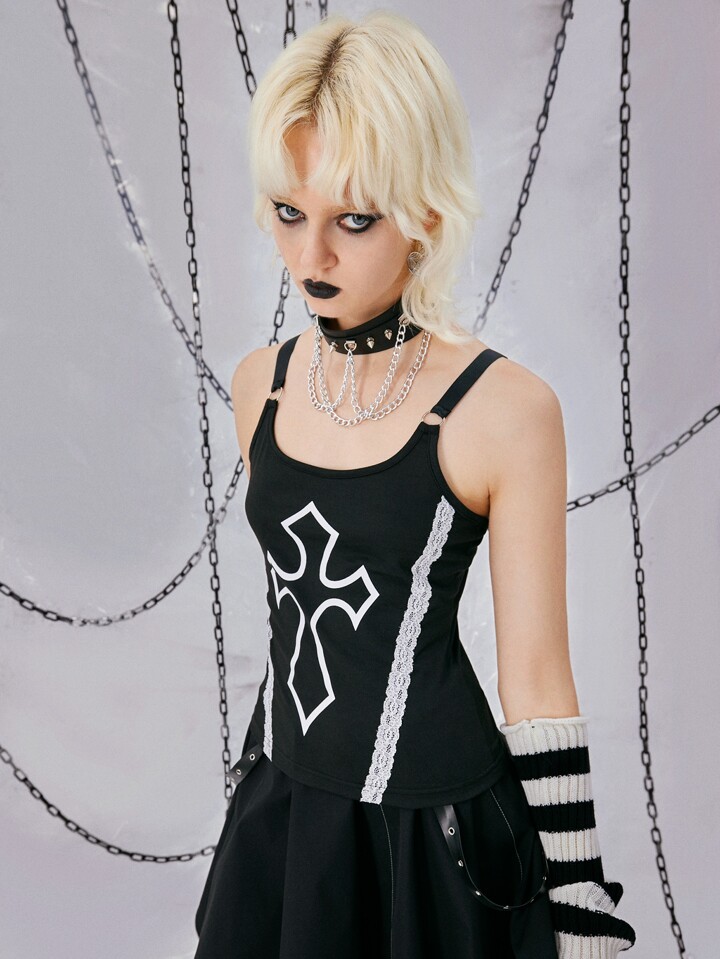Grunge Punk Graphic Print Contrast Lace Cami Top