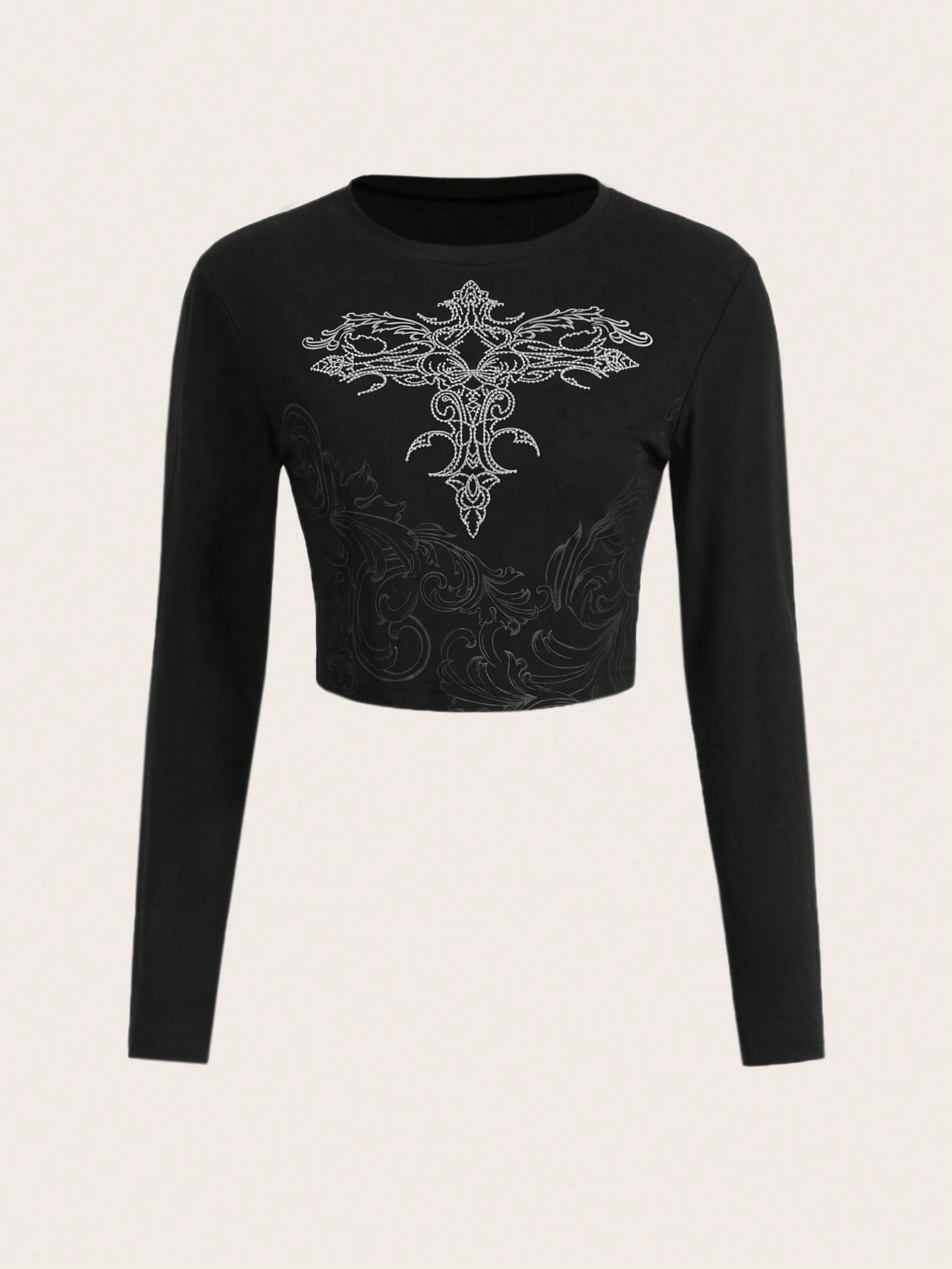 Grunge Punk Graphic Print Rhinestone Crop Tee