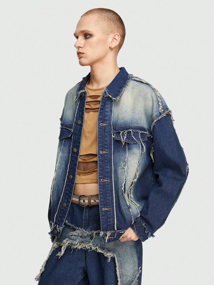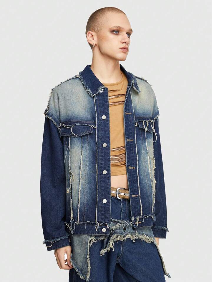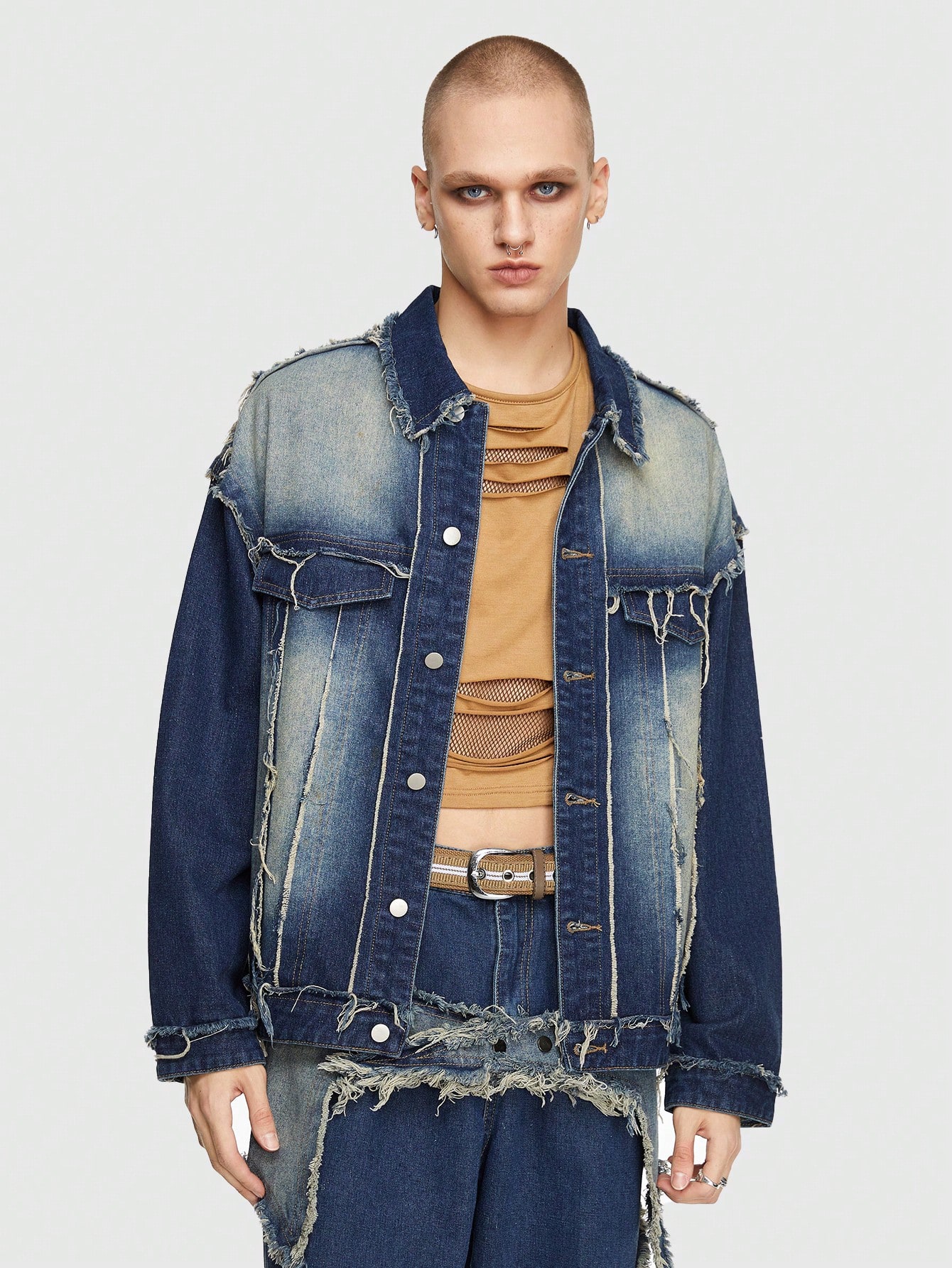 Grunge Punk Guys Bleach Wash Raw Trim Drop Shoulder Denim Jacket