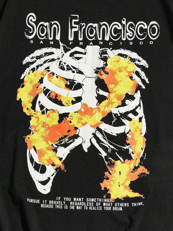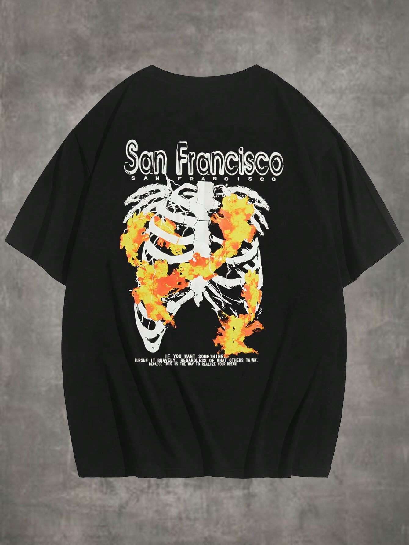 Grunge Punk Guys Fire & Skeleton Print Tee