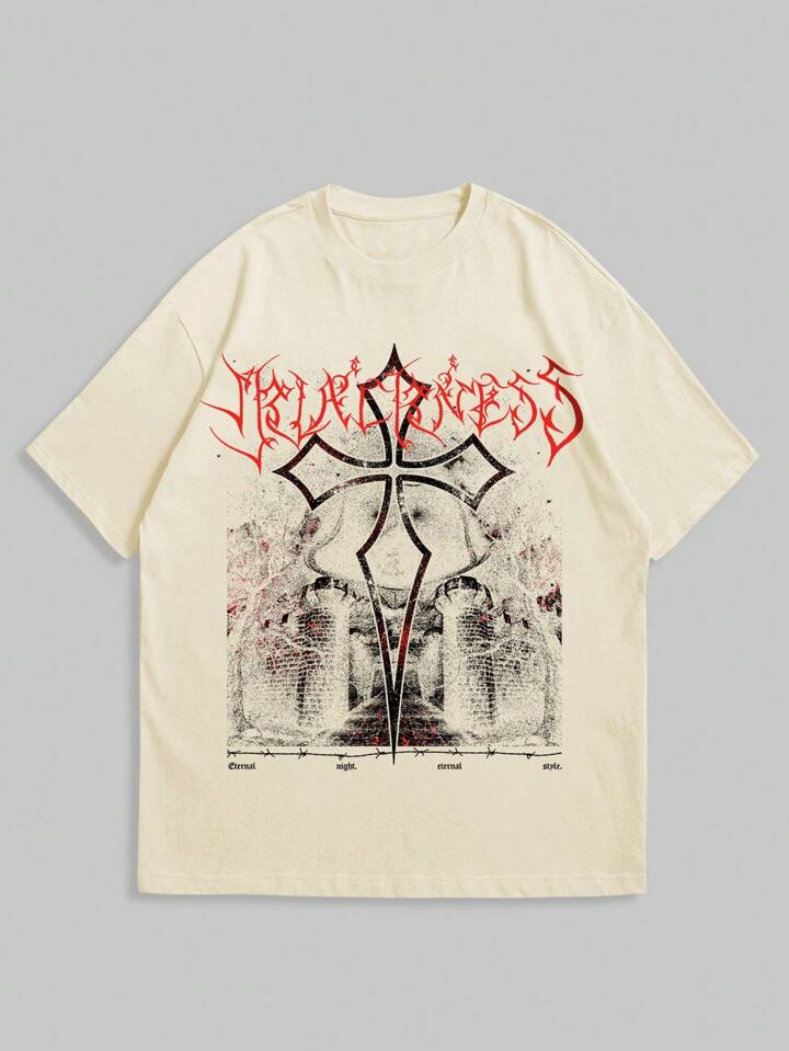 Grunge Punk Guys Letter & Cross Print Tee