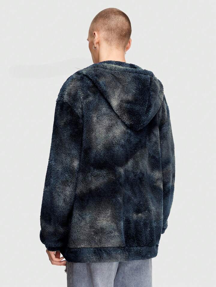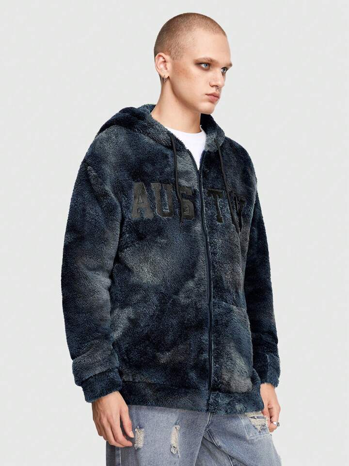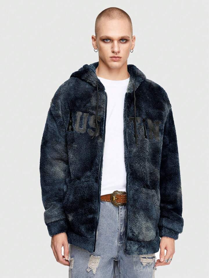 Grunge Punk Guys Letter Embroidery Tie Dye Drop Shoulder Drawstring Hooded Fleece Jacket