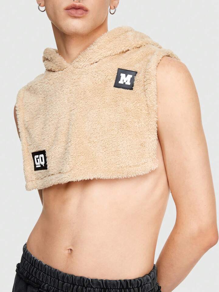Grunge Punk Guys Letter Patched Crop Hooded Teddy Sweatshirt