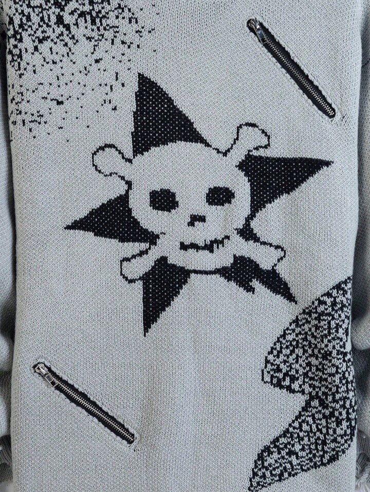 Grunge Punk Guys Skull & Star Pattern Zipper Detail Distressed Trim Sweater
