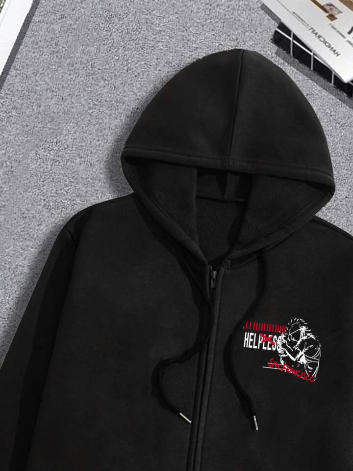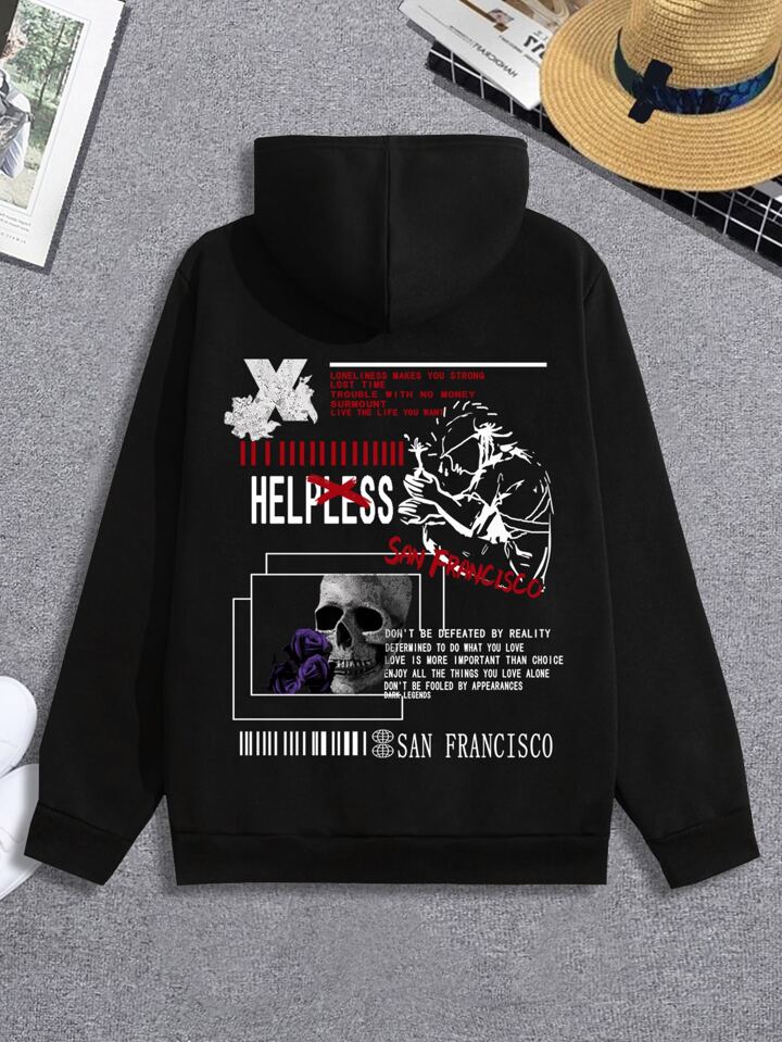 Grunge Punk Guys Slogan Skull Graphic Drawstring Hoodie