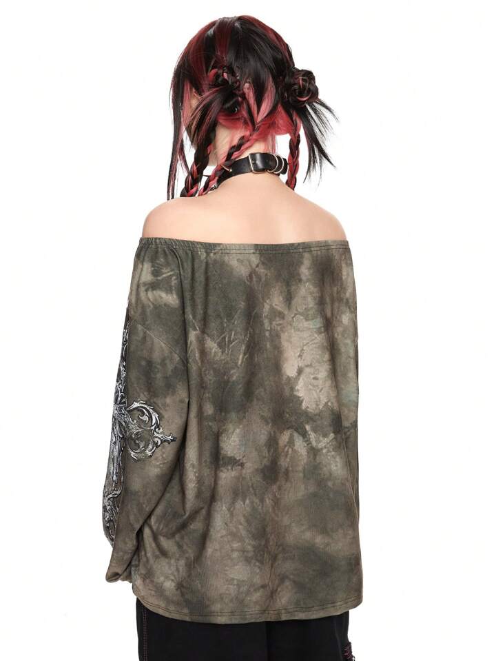Grunge Punk Halloween PUNK Loose Open Shoulder Cross & Skull Print Women T-Shirt