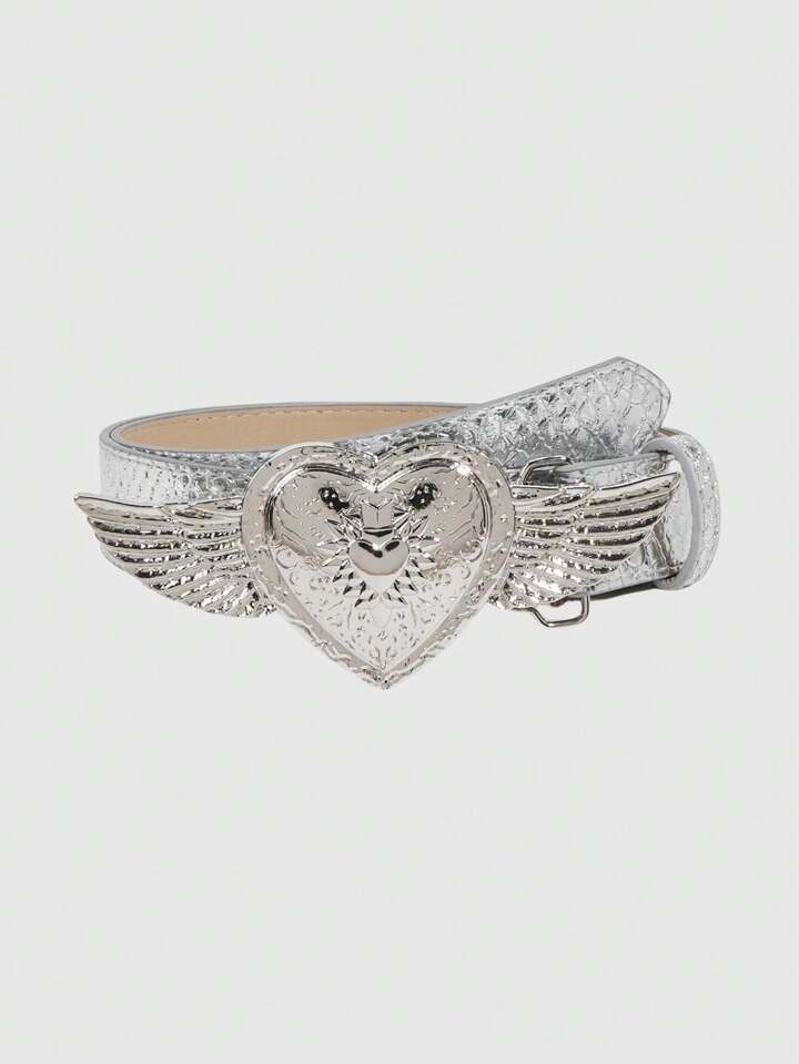 Grunge Punk Heart Wing Buckle Y2K Style Snake Pattern Silver Belt, Carnival